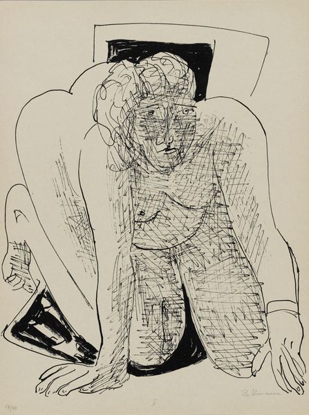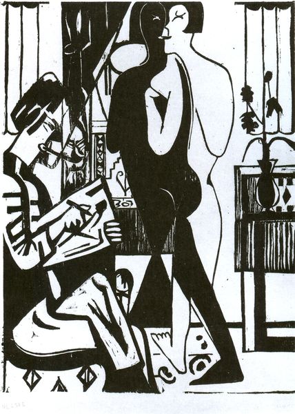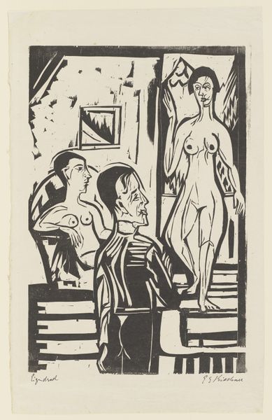 Curator: Editor: Here we have Max Beckmann's "King and Demagogue." It's a striking black and white print. The textures feel rough, almost unsettling. What stands out to you? Curator: Well, the process itself tells a story. Look at the starkness of the lines, the aggressive scratching. This isn't just about representation; it's about the labor, the physical act of making a statement. Consider the sociopolitical landscape—what materials were available, and how did Beckmann choose to use them to convey power, or the lack thereof? Editor: So, the *how* it was made is as important as the *what* is depicted? Curator: Precisely. The printmaking process allows for reproduction, dissemination, a wider reach. How does this affect the artwork's social impact, its potential to critique or influence? Editor: That shifts my perspective entirely. I was focused on the figures, but now I see the material and the means of production as central to its message. Curator: Exactly, and that's where the true power, and perhaps the critique, lies.