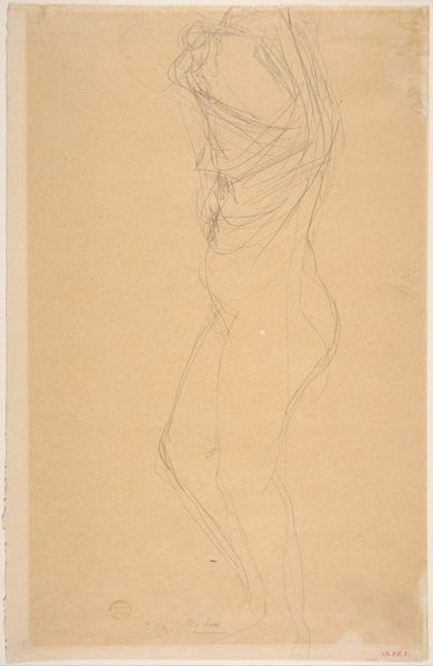 Curator: What a striking, yet simple composition. A young woman in mid-stride, ascending a step, reaching upwards. Editor: It strikes me as strangely unresolved, incomplete. Her pose feels awkward, almost frozen, caught between ascent and some unseen signal in the distance. There’s tension in her posture, don’t you think? Curator: I think so too! It’s worth noting this artwork is an unsigned pencil drawing titled "Young Woman Climbing a Step," estimated to originate around the 1890s. The anonymous artist captures a fleeting moment with sparse detail. Look at the textures and shading—especially in the voluminous fabric draping her form, giving it almost classical dimension. Editor: That contrast is crucial! The artist plays with positive and negative space in intriguing ways; look how the negative space beyond her figure pushes our gaze into the focal point. It amplifies the drama inherent in a quotidian task. She’s just going up some stairs, and yet it's depicted with such dramatic foreshortening. Curator: The up-turned reaching gesture of the figure resonates with a yearning for something beyond, as if aspiring toward the future. I'm thinking, are we witnessing perhaps a woman's ambition at the turn of the century? She might signal freedom of movement that some women were starting to gain then. Editor: Hmm, but does it achieve this sense of grandness? To me, the sketchy rendering feels preliminary. I'm drawn more to the textures of the drawing itself; the smudging around the forms is quite expressive. Curator: Well, remember that many artists were exploring different types of gestures as symbols in the late 19th century, as visual rhetoric to convey deeper cultural meanings, like ideas of personal progression or self-possession. Editor: I appreciate your interpretation. I’ll be here noticing, perhaps stubbornly, the beauty of the stark minimalism in this understated realism. Curator: Fair enough; it speaks to the multifaceted power of the symbolic and representational gesture through the artist's technique. Editor: Absolutely; seeing the possibilities makes all the difference, doesn't it?