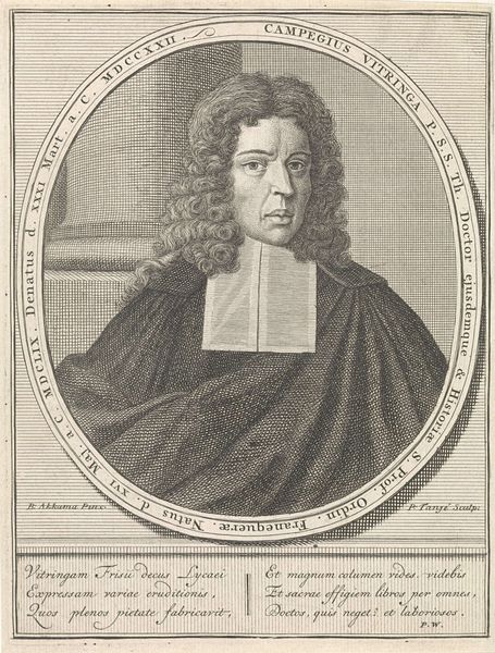 Editor: Here we have "Portret van de predikant Henricus Groenewegen," an engraving made sometime between 1694 and 1715 by Joannes de Jongh. It has a somber quality to it. The pastor looks very serious. How do you interpret the symbols at play in this portrait? Curator: What immediately strikes me is the laurel wreath encircling Groenewegen. It traditionally symbolizes triumph, honor, and immortality. Placing the pastor within this wreath elevates him, imbuing him with an aura of timeless wisdom. Notice, too, the text below. Can you decipher its intent in conjunction with the visual elements? Editor: The text seems to celebrate Groenewegen, describing him as someone who "sticht" or builds God's community through "waerheyt," truth and light. The laurel wreath visually reinforces that written praise. Curator: Precisely. The wreath and inscription together speak to the power of visual and textual symbols working together to cement a cultural memory of a respected figure. Even his clothing, the severe black robes and white collar, carries meaning. It's a carefully constructed image of piety and authority. Where else do you see symbolism at work? Editor: I think even the simple act of creating a portrait immortalizes Groenewegen. And perhaps the intense gaze is meant to communicate conviction and moral authority. I never considered how much weight clothing can carry. Curator: Indeed. This portrait reminds us that even seemingly straightforward images are layered with cultural and psychological weight, carefully constructed to project meaning across time. Thank you, it helped to appreciate the interplay of elements that shape lasting impressions. Editor: Yes, considering the cultural context helps decode visual language.