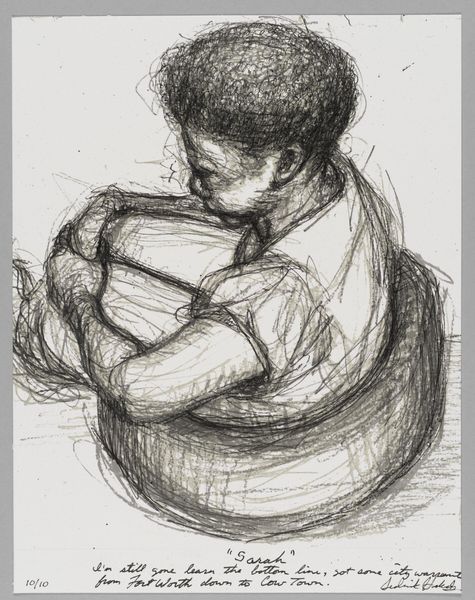 Curator: Sedrick Huckaby's "99% NO.16 Tosha," a print housed here at the Harvard Art Museums, immediately struck me with its delicate, almost melancholic air. What's your first take? Editor: The sitter's gaze certainly conveys a sense of world-weariness, doesn't it? Considering the title’s "99%," one might see it as a commentary on the socio-economic pressures faced by marginalized communities, a visual representation of resilience despite systemic obstacles. Curator: Oh, I like that. For me, it's also about the way he uses line and shadow, how he suggests form with such economy. The almost ethereal smoke, the rawness of the unfinished strokes...it's like a fleeting memory. Editor: Absolutely. And let’s not forget the sitter’s pose—legs crossed, hand raised. There’s a subtle defiance there, a reclaiming of space and visibility within a potentially hostile environment. Curator: It's a powerful statement, made with such understated grace. I think Huckaby's capturing something truly essential about the human spirit. Editor: Yes, it’s a potent reminder of the individual within broader social narratives, and a powerful call to action, indeed.