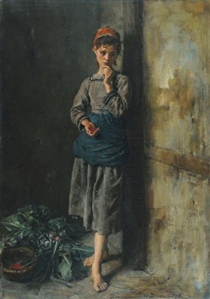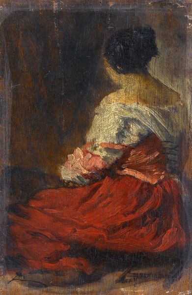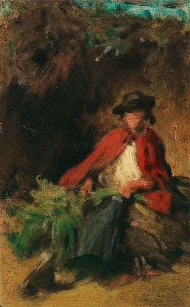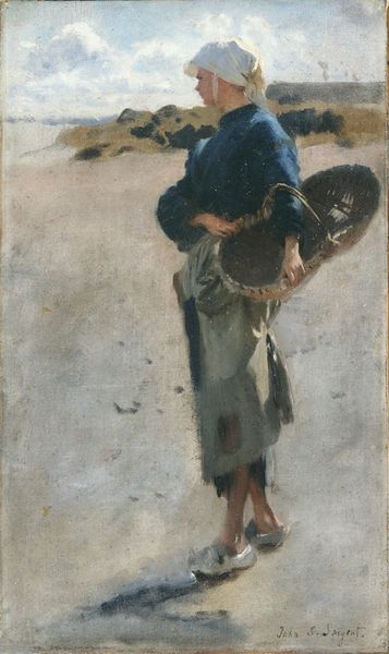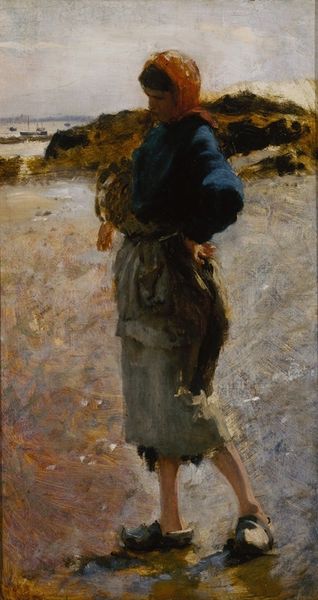 Curator: Heaviness. That's the first word that comes to mind. Everything seems to droop in this painting. Editor: You're looking at "A Peasant Woman carrying a Sack," painted in 1889 by Richard Nicolaüs Roland Holst. It’s an oil on, well, probably canvas, given the period. Curator: Right, but look at the way the browns and blacks dominate. Her face is obscured, the sack is... a burden, literally and figuratively. It’s as if the weight of the world is pressing down on her. It's like watching someone live under the daily pressure of being someone people walk past. Editor: Indeed, the limited palette focuses attention on form and texture. Notice how Holst uses visible brushstrokes to define the woman's figure and the landscape. It creates a tactile quality, as though you could reach out and feel the coarse fabric of her clothes and the roughness of the path. Her simple garments contrast against what I interpret as soft brushstrokes that shape this somewhat nebulous surrounding. Curator: Tactile...yes! You're right, but it also adds to the sense of weariness. Everything's worn down, rough around the edges. It's in the details... Her shoes, for example... look to be wooden. Editor: Clogs, likely. Function dictated their presence, form followed. And it reinforces this theme and context we see of everyday, back-breaking work of 19th century peasant life. Curator: Exactly! It's a potent reminder that art can be about empathy and the human condition as much as aesthetics. What story do we assume of the figure, and is she a metaphor of societal weight? I'm reminded of a poem I once wrote... but I digress. What's more amazing is the realism shown and the almost romantic painting in an age of new thinking and abstract form arriving. I wonder how Holst saw his place? Editor: That is very true, in his artistic ecosystem. Now you've given me an idea to dig up his influences. This glimpse into a hard life really stays with you, doesn’t it? The materiality of the work lends this… authenticity that makes one reflect on their life as well, in comparison. Curator: Absolutely. It lingers. I'll carry that feeling with me today for certain, for a little while. Thanks for making sure I was open to this one, old friend.