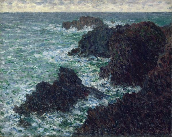 Editor: This is Paul Gauguin's "La Côte rocheuse, ou Rochers au bord de la mer," painted in 1886 using oil on canvas. It gives me such a serene feeling, almost dreamlike. What catches your eye, what’s your interpretation of it? Curator: Gauguin’s seaside scenes are always interesting when considering his later pursuit of "authenticity" in Tahiti. This painting, with its visible brushstrokes and muted colors, fits into the Post-Impressionist moment. But, how do we reconcile its fairly conventional subject matter with Gauguin’s radical artistic journey? Do you see anything here that anticipates that shift? Editor: I guess I don’t see the bold colors that come to mind when I think of his Tahitian paintings. It feels… restrained. So was he trying to find a market, before his work would evolve and when it became more politically charged? Curator: Exactly. Remember, the art world in Paris was still largely controlled by the Salon system at this time. An artist like Gauguin needed to navigate these institutions to gain recognition. Was his vision of Tahiti also formed in response to the perceived decadence or restriction in France at the time? Think about the context: Colonialism was a powerful force and a mindset back then. Editor: That makes sense. It's interesting to consider this landscape not just as a scene but as a product of that social and political climate. Gauguin wasn’t painting untouched reality; he was already engaging with cultural expectations. Curator: Precisely. Seeing the painting within the history of art institutions really transforms our understanding of his later work and what exactly he may have been rejecting – or, perhaps more problematically, appropriating. Editor: I'll never look at a Gauguin seascape the same way again. This really shows how important it is to place art within the society that created it.