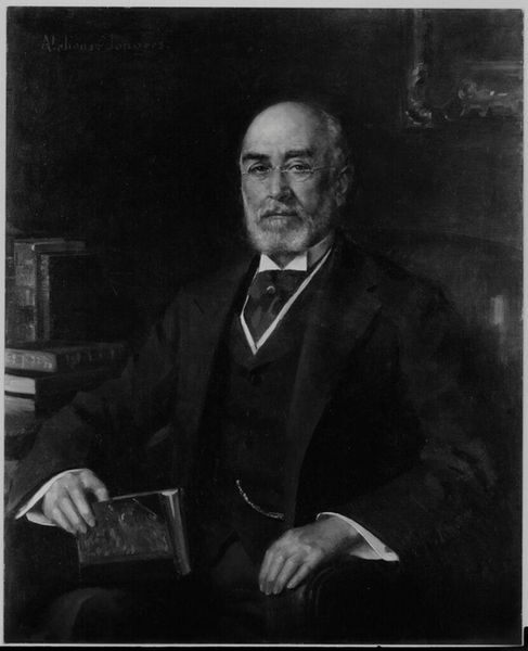 Curator: Here we see William Valentine Schevill’s self-portrait, currently held at the Harvard Art Museums. Look at the raw brushwork used to build this image. Editor: It feels very immediate, doesn’t it? The materiality of the paint is so present. I’m interested in how the social context of the art world might have influenced this artist’s choice to depict himself in this way. Curator: Indeed. The visible brushstrokes and the almost hurried application of paint seem to challenge traditional notions of artistic skill and the artist’s place within a hierarchy. Editor: And that teal background almost clashes with the formal suit. It's like he's deliberately blurring the lines between respectability and rebellion within the established artistic institutions of his time. Curator: The bow tie, though, that touch of red almost insists upon a certain… craft, a certain elegance despite the overall effect. Editor: I am left wondering about the image's place, or lack thereof, within the wider social and artistic narrative of portraiture. Curator: A narrative of shifting social and artistic values, brought to life by the materiality of oil paint itself. Thanks for sharing your thoughts!