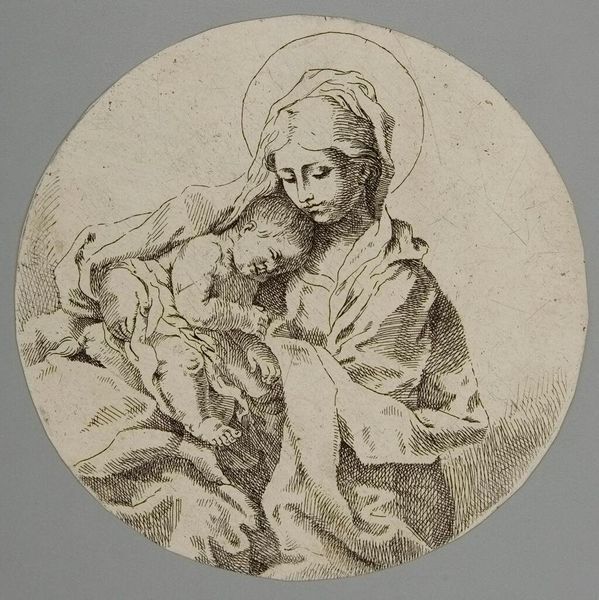 Curator: Let’s examine this "Madonna and Child" by Guido Reni. The artwork can be found at the Harvard Art Museums. Editor: The etching gives off a feeling of tenderness. Look at the delicate lines creating the figures, it's visually very soothing. Curator: Absolutely. The image evokes a specific historical narrative. Consider the representations of motherhood and divinity during the Counter-Reformation. How did societal expectations shape Reni's portrayal? Editor: The composition leads the eye from the Madonna's veiled head, downward in a circular motion ending at the child's hand. The lines, the tonality, it creates a strong aesthetic unity. Curator: I agree. Moreover, exploring the power dynamics, the gaze, what does it say about the role of women, both divine and earthly, during that era? Editor: Perhaps the artist simply sought to capture the essence of maternal love, expressed through purely formal means. Curator: Perhaps, yet even formal choices reflect underlying social and cultural values. Editor: A compelling argument, indeed.