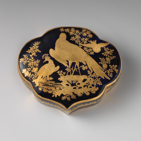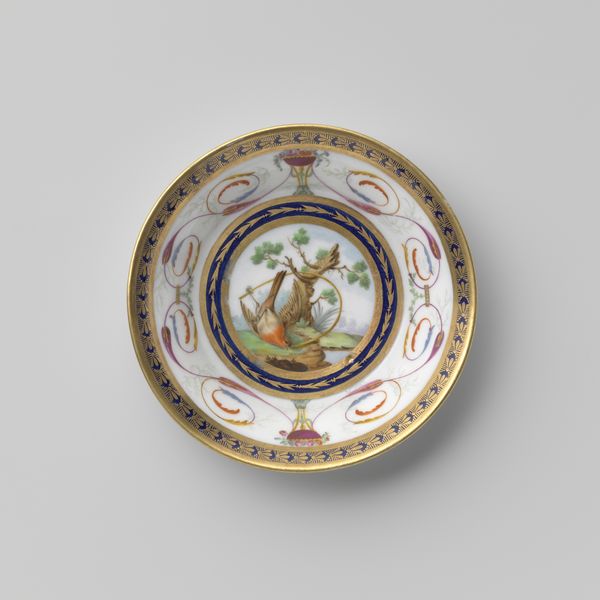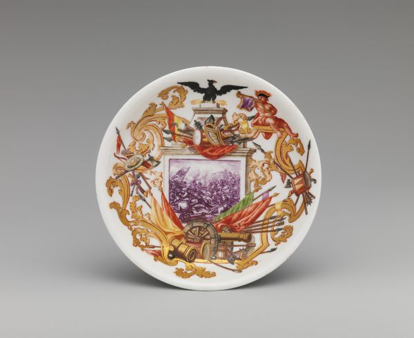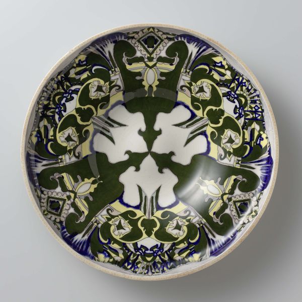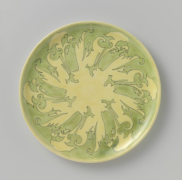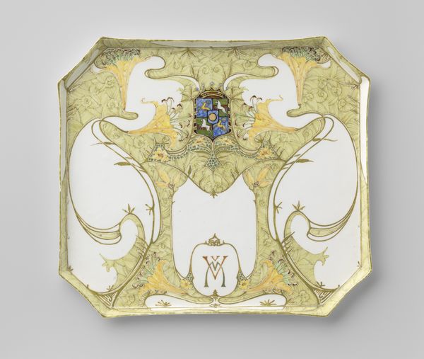 Editor: This is a ceramic plate from around 1900 by N.V. Haagsche Plateelfabriek Rozenburg, titled "Schotel, deel van een tête-à-tête, beschilderd met lelies," which roughly translates to "Dish, part of a tea set, painted with lilies." The intricate Art Nouveau design really catches my eye. What can you tell me about it? Curator: Well, this plate speaks volumes about the era in which it was created. The Rozenburg factory was instrumental in the Dutch Art Nouveau movement, and this piece highlights how art was becoming increasingly integrated into everyday life, specifically luxury items marketed to an upwardly mobile middle class. Do you notice anything specific in its design? Editor: The shield in the middle feels...almost heraldic? Like it's referencing something important, some family or place. But it also feels kind of playful against the flowing lilies. Curator: Exactly! The shield is intentionally referencing traditional displays of power and status. Yet, by incorporating it into a decorative, mass-producible object like this plate, Rozenburg democratized these symbols, subtly undermining their exclusivity. It's an interesting interplay of tradition and modernity, don't you think? Editor: I do! So, this wasn’t just about making something beautiful, but about changing how people viewed status and art? Curator: Precisely. It's a fantastic example of how art enters the domestic sphere and renegotiates societal values, pushing back against older ideas about who could claim lineage and sophistication. It questions traditional power structures through aesthetic subversion. Editor: That’s a perspective I hadn't considered before. It adds so much depth to appreciating the beauty of this plate. Thanks! Curator: My pleasure. It's in considering how even decorative pieces can reflect cultural shifts that we start to truly understand their significance.