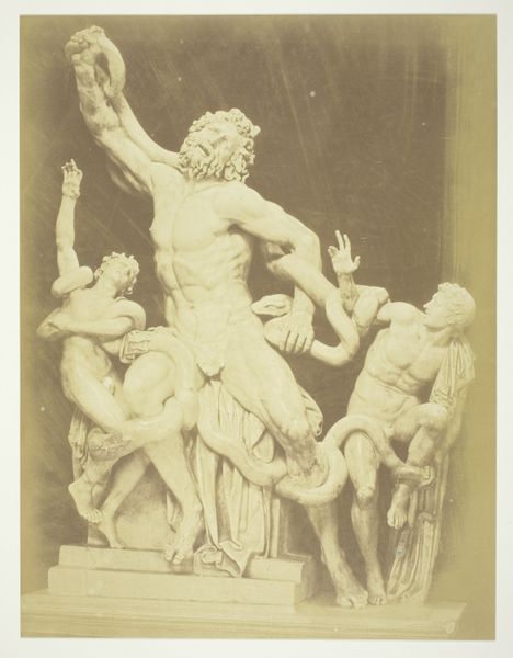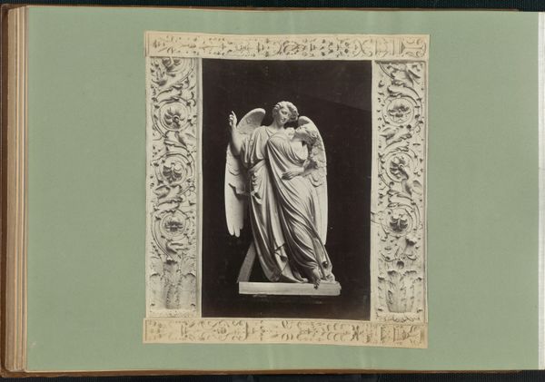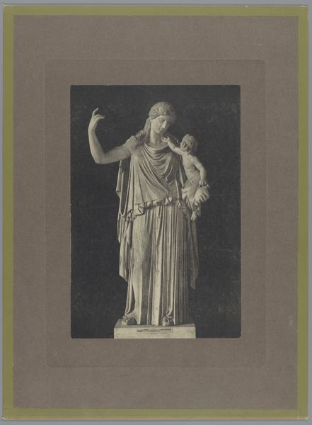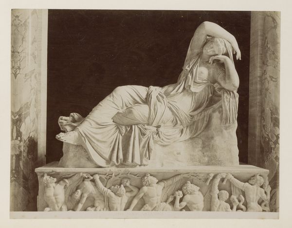 This photogravure captures a section of the tomb monument for Canova in Venice. The Fratelli Alinari have framed the somber ensemble of figures, presenting a scene imbued with neoclassical order and a deep sense of mourning. The monochromatic tones and stark lighting emphasize the monument's formal structure—a series of horizontal steps offset by the verticality of the sculpted figures. Note how the composition is structured around a play of geometric forms and flowing drapery. A veiled figure stands rigidly to the left, its form sharply contrasting the soft, cascading lines of its garment, while adjacent, a procession of figures descends, each pose suggesting a contained grief. This carefully constructed arrangement invites us to consider the cultural codes of mourning and representation. The photograph itself is an interpretation, not just a reproduction. Alinari's choice to highlight texture and shadow functions as a semiotic system in which light and form articulate absence and loss, contributing to a discourse about memory and commemoration.