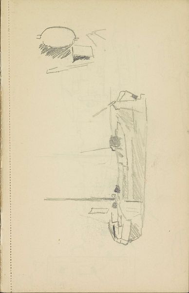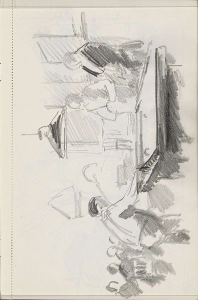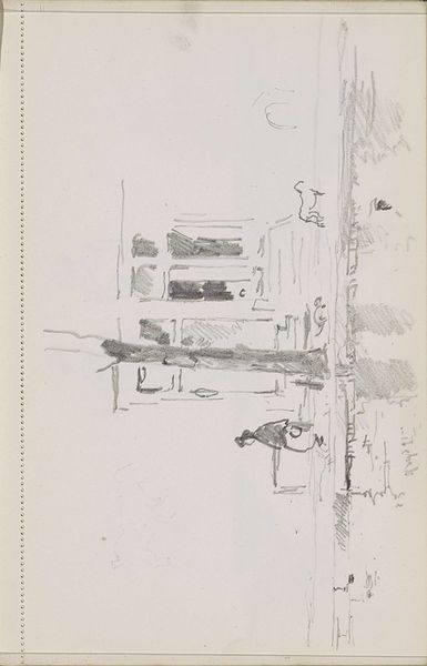 Curator: This pencil drawing, located in the Rijksmuseum, is entitled "Two Seated Men in a Rowboat near a Dock". Cornelis Vreedenburgh likely produced it sometime between 1890 and 1946. Editor: The sketch certainly possesses an evocative simplicity; the subtle suggestion of figures almost lost within the environment imparts a tranquil quality. What is immediately compelling is its sense of impermanence, a fleeting impression captured on paper. Curator: Indeed, this immediacy offers us insights into the cultural value of leisure. Think about it: the act of boating itself. Was it a common pastime, accessible across social classes during that period, or a leisure pursuit indicative of privilege? Editor: Visually, the application of pencil lines seems deliberate. There's a hierarchy, thicker lines describing the central subjects—two seated men—while fainter lines map out their setting, enhancing the contrast. This stylistic decision enhances clarity and focus. Curator: And if we examine his use of line in representing architectural elements alongside these figures, we might assume that it captures a moment of intersection between urbanization and individual experience. What narrative power rests, simply, with depicting individuals near constructed places? What story might he have tried to convey? Editor: Its restricted use of lines forces the viewer to engage more dynamically with this artwork; our minds inevitably complete what the sketch withholds, thus forming a bridge of personal meaning. Curator: Art indeed serves as both a reflector of, and agent within society, mirroring as it also helps to shape society's conventions. This piece could even encourage us to see, anew, those very conventions within our contemporary lives. Editor: I concur entirely; a compelling lesson about seeing through suggestive means, even for art that has few of its own formal certainties.