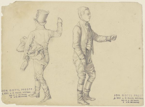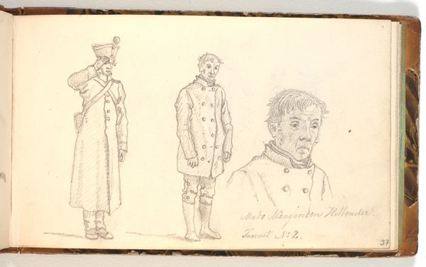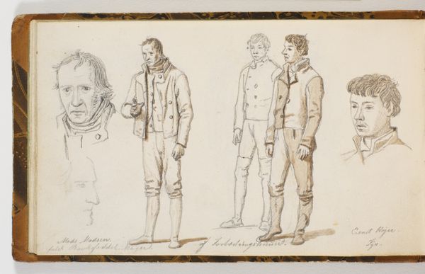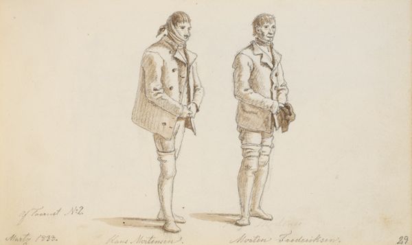 Curator: Rørbye's 1832 work, "Three Studies of Prisoners from the Improvement House," strikes me as unsettling yet delicately rendered. There's something immediately captivating in its understated quality. Editor: Unsettling is right. It's the quiet expressions on their faces, coupled with their somewhat absurd garb, that creates such tension. It’s both comical and tragic at once. Curator: It's interesting to see this almost objective, ethnographic-like depiction of these prisoners during a period of significant social reform in Denmark. The "Improvement House" itself represents an evolving approach to incarceration—moving from purely punitive to rehabilitation. Editor: And yet, chains remain, a visual reminder of constraint and the societal mechanisms that brand these individuals. The slight variations in their posture and the details like the manacled feet highlight their individuality, resisting a purely dehumanizing representation. You see echoes of phrenology and other dubious sciences in the attempt to categorise individuals, a common thread in nineteenth-century Europe, but it's countered with a quiet observation. Curator: Exactly. Rørbye's background is academic. So, the meticulous, almost clinical observation is not surprising. He was trained to depict reality accurately. Editor: But is it truly accurate? I wonder to what extent Rørbye's perspective and the societal prejudices of the time colored his representation of these men. His depiction, while technically skilled, perhaps tells us more about societal anxieties and reformist zeal than about the actual lived experiences of the prisoners. Curator: I see your point, but perhaps its power lies in this tension. Rørbye wasn't overtly judgmental. He offers a glimpse into a particular historical moment, capturing its contradictions. Editor: It prompts me to think critically about our carceral systems today. In what ways are we simply repackaging old prejudices and justifications for controlling marginalized populations? It highlights that punishment and "rehabilitation" can, at times, mask deeper inequalities and power structures. Curator: Absolutely. Considering all this, I think we see the power in the drawing’s unassuming appearance. Editor: It leaves us with uncomfortable questions about justice and representation. Perhaps that’s its ultimate value.