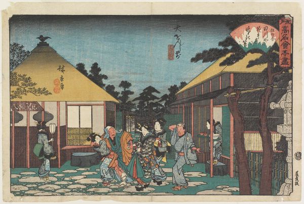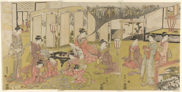 Kitao Shigemasa’s "Hakuba no Sechie" is a woodblock print with subdued colors that captures a formal court scene. The arrangement of figures and architecture offers a glimpse into Edo period Japan. Notice the spatial organization, split into two distinct yet connected panels. On the left, a group of figures stands near a raised structure, while on the right, another group accompanies a white horse, all set against a pale background. Shigemasa balances the composition by contrasting the dark robes of the figures on the left with the lighter attire of those on the right, drawing the eye across the entire artwork. This division of space and the rhythmic placement of figures work to create a semiotic system of signs. The arrangement invites a reading of social relationships and ritualistic practices. The white horse itself—"Hakuba"—becomes a symbol of purity and imperial power, suggesting themes of governance and social harmony. The lines within the architecture and the folds of the clothing add a textural richness. The pale sky is not merely background but a subtle element that destabilizes any fixed reading, leaving room for interpretation and reflection.