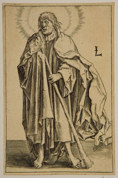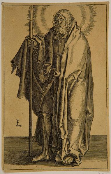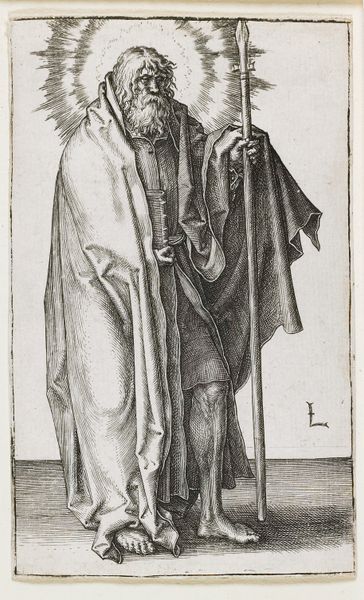 Editor: This is Lucas van Leyden’s engraving of "Saint Matthew," created around 1510. The level of detail achieved with simple lines is captivating, and Matthew seems to gaze pensively into the distance. What story do you see in this piece? Curator: Van Leyden created this Saint Matthew during the Northern Renaissance. Notice how this image exists as a print - that is a key socio-political factor! It made it possible for such images to spread quickly through society. He's part of a set depicting the apostles, meant for a growing urban audience with access to such printed images. Editor: How were such images consumed at the time? Curator: This work represents a fascinating moment where religious imagery meets a burgeoning market for art. Disseminated in print, individual devotion became coupled with a developing taste for collecting and connoisseurship. Consider the rise of printmaking—it mirrors the democratizing potential of the Reformation brewing at the time. How does knowing this was reproducible impact your view of the work? Editor: It makes me wonder if prints like this contributed to new forms of personal religious expression or were simply another way for the church to disseminate approved images? Curator: An interesting question! Certainly, both possibilities exist. And art patronage became distributed and uncontrolled in the sense that such production went directly to a broad, anonymous market, rather than to fulfill an aristocratic or church commission. Now, look closer at his pose; he isn't posed regally, like some paintings that would be displayed at the altar of a church; is there anything surprising about that? Editor: Yes, it humanizes him somehow, makes him less remote. Thank you. Thinking about the changing landscape of religion and art ownership makes this print far more complex than just a religious image.