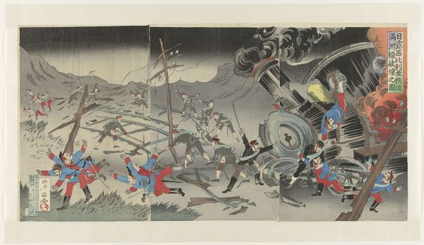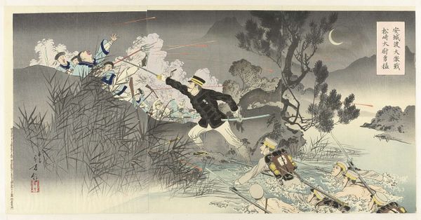 Curator: Before us we have "General Sasa Narimasa in a Heavy Snowstorm", a striking 1897 woodblock print by Yoshu Chikanobu currently held at the Rijksmuseum. Editor: Wow. The snow feels almost like daggers. So harsh. There’s a stark beauty in the way the artist captures that brutal winter landscape, don't you think? Curator: Absolutely. Chikanobu utilizes the ukiyo-e tradition here, yet imbues it with a late 19th-century sensibility. You can see it in the meticulous rendering of the samurai's armor and the horse's musculature. Note, also, the economical use of line to suggest a relentless blizzard. It really emphasizes the production values for mass consumption. Editor: He looks so determined. Or is it resignation? I almost feel like I can hear the wind howling through those mountains. I imagine the weight of his purpose mirrored by the sheer physical weight of the snow itself. The journey he must have undertaken... I wonder if his spirit will break. Curator: His journey is as much a product of artistic construction as historical reality. We can trace how printmakers like Chikanobu engaged with mythologized narratives to both celebrate and subtly critique traditional hierarchies, offering commentary on changing socio-political landscapes during the Meiji era through figuration. Editor: Do you think his coat is warm enough? It looks magnificent! It's quite easy to get lost in contemplation about the warrior himself and the artist behind this magnificent work of art! Curator: Precisely! The artistry and social commentary intertwined. This work is more than an illustration, it offers layers that can be peeled. Editor: I completely agree, that consideration of art as a multifaceted material and social production reveals so much. Curator: A good thing we wrapped this up: my fingers were getting cold just from looking at the print. Editor: Maybe hot chocolate later? In any case, let's warm ourselves with a new piece now, shall we?