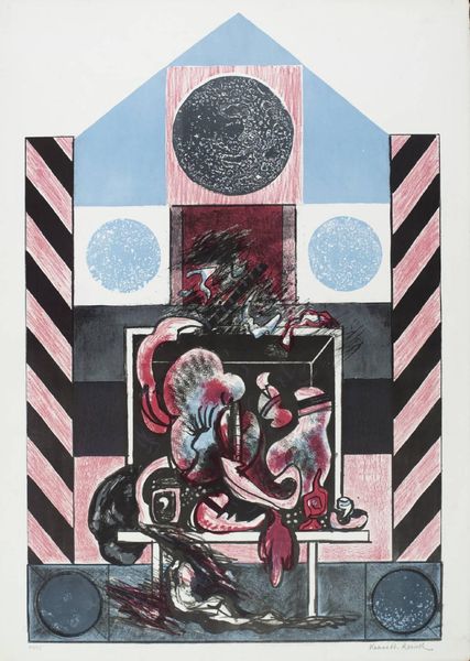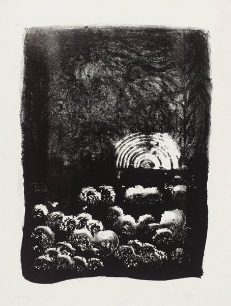 Curator: This is "Canto IX" by Esq Tom Phillips. Created without a date, this image held in the Tate collections presents a striking composition in monochrome print. Editor: The lions are intense; they feel like symbols of power struggling within some imposed structure, those dark vertical bars. Curator: The symbolism of lions is age-old, power, royalty, courage. But consider the context; how does Phillips, working in the late 20th century, engage with these established meanings? Editor: And the way the heraldic lion at the top almost seems to float, detached. It feels like a critical commentary on inherited authority. Curator: Precisely, a disruption of tradition. Phillips invites us to question the narratives we inherit. Editor: Ultimately, it’s a powerful image that sparks so much thought about authority and challenge. Curator: Agreed, a testament to the enduring relevance of historical symbols.