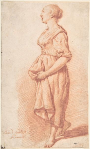 Curator: This drawing, "Stehendes Mädchen in Tracht," or "Standing Girl in Traditional Dress," comes to us from Georg Melchior Kraus, dating around 1771 to 1772. It is held in the Städel Museum's collection. Editor: My first impression is one of simplicity and almost haunting quietness. The limited palette creates a muted, somewhat melancholy mood. Curator: Absolutely. And that simplicity speaks to a critical tension within 18th-century social structures. Consider the representation of young women, especially those in 'traditional dress'. What performative role are they occupying, and how much agency do they truly possess in crafting their own image? What constraints governed her social visibility, as a woman depicted from behind and somewhat anonymized? Editor: It’s the washes of ink that immediately catch my eye. Note how Kraus employs thin, translucent layers to define the fabric, playing with light and shadow to give form to the figure. It creates a beautiful tonal harmony. Curator: Precisely. That rendering of form allows for a potent reading. It allows for considering broader debates about class and cultural identity within the burgeoning Enlightenment. Her very 'ordinariness' in that era pushes boundaries – a commentary on authentic representation versus idealized portraiture. Editor: I find myself drawn to the pose – the slightly awkward angle, her hands clasped behind her back. This draws me into studying the figure itself. Semiotically, what meanings might be gleaned? The composition directs our attention towards form over the sitter's personality. Curator: Yes, it's precisely that turn away that fascinates. The averted gaze allows for a collective projection of anxieties, expectations, and social scripts mapped onto the female form. This artwork provides access to reconsider the legacy of power and the male gaze within the visual lexicon. Editor: It is a fascinating dialogue between form and content, isn’t it? Looking more at the balance, the artist guides my focus. Kraus guides the viewer to appreciate not just who is represented but how, creating layers of visual significance. Curator: It forces us to consider those complexities and how they shaped not only the artwork, but broader understandings of identity and social visibility. Editor: A beautiful piece offering many formal perspectives. Curator: Agreed, a compelling reflection on the historical constructs.