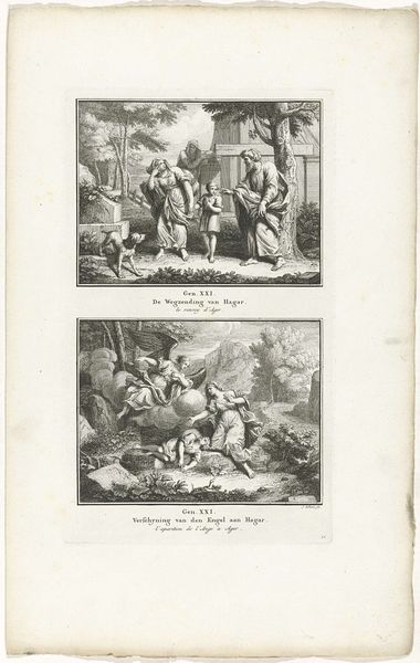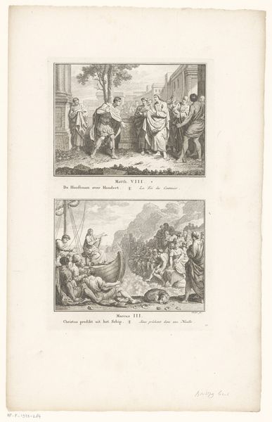 Curator: Here we have a print titled "Wonder der broden en Christus loopt over het water," or "Miracle of the Loaves and Christ Walking on Water," created in 1791 by Simon Fokke. It’s currently housed here at the Rijksmuseum. Editor: It immediately strikes me as stark—the stark contrast between the etched lines and the paper, creating these dramatic scenes. The very *making* of this piece, the meticulous labour of carving into a plate… it speaks of dedication and control, mirroring, perhaps, the stories depicted. Curator: Absolutely. The starkness underscores the powerful themes. Fokke is depicting two miracles from the Gospel of Matthew: the feeding of the five thousand and Christ walking on the water, saving Peter from drowning. Both are deeply symbolic of divine intervention and the power of faith in overcoming earthly limitations. Editor: I’m curious about the printmaking process here. Think of the societal context – prints allowed for mass distribution. The choice of printmaking transforms religious narrative from rare illuminated manuscripts seen only by the wealthy, into something much more accessible. The means of production shapes consumption. Curator: That accessibility is key to its symbolic function. Religious imagery wasn’t just about aesthetics; it was about transmitting knowledge, reinforcing belief. Notice the detailed iconography in both scenes: Christ's outstretched hand, the abundance of bread—they are potent visual shorthand, instantly recognizable to a wide audience, reinforcing specific theologies and moral values. Editor: Right, the *function* becomes intrinsically tied to the *form.* This wasn't meant to be purely decorative; it was about propagation. It’s easy to overlook, in our digital age, the sheer power an easily reproduced image held in disseminating ideas, influencing thought on a massive scale. Curator: And that’s the beauty of engaging with art from the past – it provides us with insight into not just what people believed, but *how* they structured their understanding of the world. It becomes a fascinating point of entry to understand cultural and religious sensibilities. Editor: Exactly. Analyzing art, especially prints like these, as social and material artifacts offers invaluable insight into how beliefs were made tangible, and how their very dissemination helped shape collective consciousness. Curator: A fruitful encounter indeed. I'm drawn to how this piece exemplifies cultural memory sustained through visual symbols. Editor: I concur, observing the materials and their mode of distribution gives such rich insights into social contexts.
