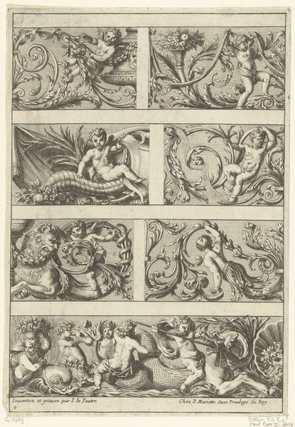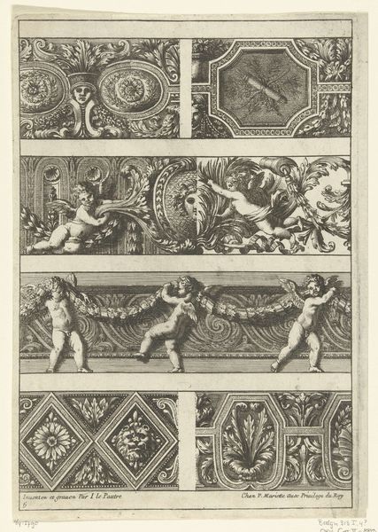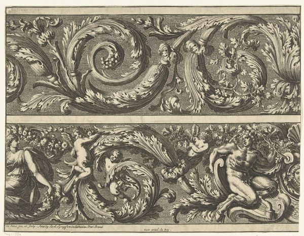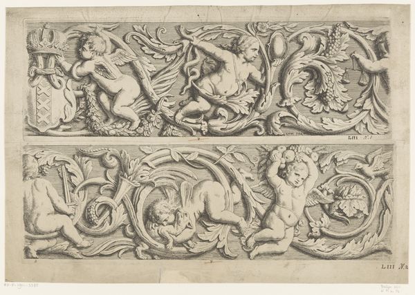 Jean Lepautre made these two friezes with acanthus scrolls and putti sometime in the 17th century. These prints were made through engraving, a printmaking technique where an image is incised onto a metal plate, which is then used to create multiple impressions. The artist would have painstakingly carved the design into the metal, using tools to create lines that hold ink. The depth and density of the lines determine the visual weight and texture of the final print. The friezes are filled with detailed, stylized acanthus leaves and playful putti, or cherubic figures. The repetitive nature of printmaking allowed for the wide distribution of decorative designs, influencing the aesthetics of interiors and furnishings across Europe. The level of skill required for engraving meant it was often a specialized profession, relying on workshops of skilled artisans. Understanding the labor-intensive process of printmaking helps us appreciate the artistry and craft involved in producing these images, blurring the lines between fine art and design.