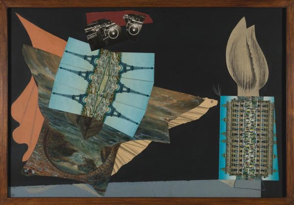 Curator: This is Salvador Dali’s 1960 painting, “Ciel hyperxiologique.” Editor: My initial impression? There's an unsettling tension here, a cool yet disquieting effect with its muted palette and geometrically divided plane. Curator: Indeed. Dali painted it during a period preoccupied with nuclear mysticism, when the anxieties of the atomic age heavily influenced his imagery. He was also increasingly focused on representing objects in space and time. Editor: I see what you mean about anxieties— the sky and sea offer a traditional landscape vista that recedes behind and beyond these odd, almost architectural planes of a grayish, wrinkling fabric, seemingly impaled with nails. It's visually unsettling. Curator: Consider how Dali subverts the genre of landscape. He employs the illusionistic rendering we expect, yet populates it with objects defying logic, creating a "hyperxiological sky", something beyond objective value or known reality. Notice also how the canvas plane divides our focus in two discrete parts? Editor: Yes, almost as though reality itself has fractured. It's a compelling construction— the harsh lines offset by those surreal, melting forms he's known for, all those seemingly ordinary elements, like the nails, made disturbing. What do they signify here? Curator: One interpretation situates Dali reacting to what he believed to be the collapse of modern systems, which, after two major world wars, must be fixed. That's one of the most common theories; although I suggest an examination of formal arrangement and Dali's mastery over realism subverted through unusual compositional tactics to unnerve. The details, perfectly rendered, pull you in, only to eject you. Editor: So, while reflecting social anxiety and historical tensions, he prioritized the sheer aesthetic force— that calculated disturbance achieved through those compositional juxtapositions? Curator: Precisely. For Dali, shock was integral. Whether we interpret through cultural context or formal elements, this canvas undeniably elicits a response. Editor: Agreed. Its effectiveness arises as much from its disconcerting context as its bizarrely compelling composition. Curator: A synthesis that characterizes so much of Dali’s genius. Editor: Quite. I’ll remember that sensation of cool, precise anxiety.