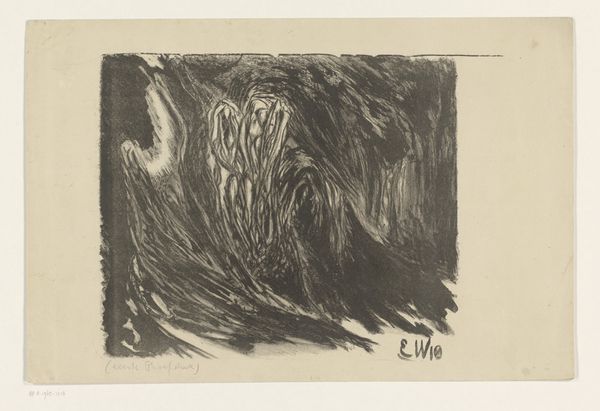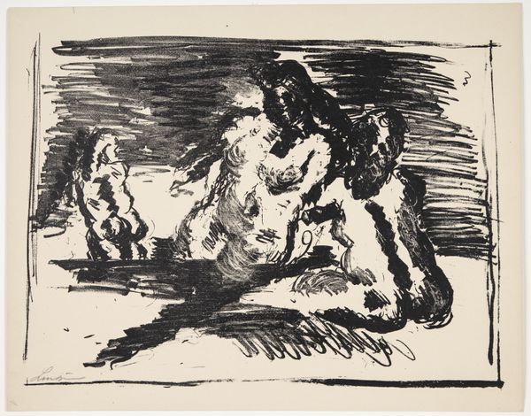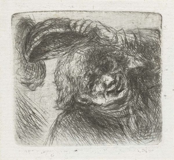 Curator: We are looking at Paul-Albert Besnard's "Leda Sleeping," an etching dating back to 1913. Editor: My initial impression is one of disquiet. The tangled lines create a sense of unease, of something lurking just beneath the surface of the composition. Curator: The dense cross-hatching certainly contributes to that feeling. It almost obscures the figures of Leda and the swan, blending them into a single, textured form. The lack of clean lines and distinct forms moves beyond pure representation, invoking a symbolic dimension. Editor: Absolutely. Considering the myth of Leda and the Swan, that sense of obfuscation feels pointed. It mirrors the violence inherent in the narrative, a kind of visual violation made all the more unsettling by its hazy depiction. There is nothing romantic here; it's all dark encounter. Curator: Precisely. The artist utilizes a limited tonal range, mostly darks, to express an intensity. Note how the swirling lines create movement, emphasizing the dramatic tension between the figures. The absence of detail invites multiple interpretations of the act itself, allowing the viewer to contemplate on themes of power and desire. Editor: Yes, and look how the swan's form seems to dominate Leda. The work invites us to grapple with the intersection of myth, power, and the female body within historical art narratives, prompting critical analysis rather than passive observation. The composition seems to question what is being concealed, inviting us to probe uncomfortable aspects within art history. Curator: A thought-provoking print from Besnard; its formal qualities invite deep analysis of his mark-making, revealing a visual story with layered meaning. Editor: An uncomfortable but important contribution that unearths an aesthetic experience from a well known myth and invites deeper conversation.