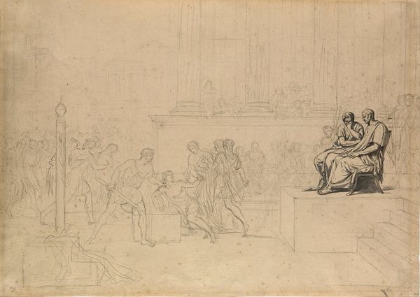 Jürgen Ovens created this drawing of the wedding between Duke Frederik III and Maria Elisabeth in 1631. The delicate sketch is rendered in brown ink on paper. The composition centres on the matrimonial act itself, framed by architectural columns and drapery that provide a stage-like setting. Attendants flank the wedding couple, creating a scene of courtly formality. Ovens uses line to define form, with the architecture providing a rigid structure. In contrast, the figures are delineated with softer, more fluid strokes, which gives them a sense of movement and life. The inscriptions at the bottom, written in a different hand, serve as annotations, perhaps from a later viewer or collector, adding layers of interpretation to the image. This interplay between the artistic rendering and later commentary reflects how meanings shift over time, inviting us to consider how historical and cultural contexts shape our understanding of art.
