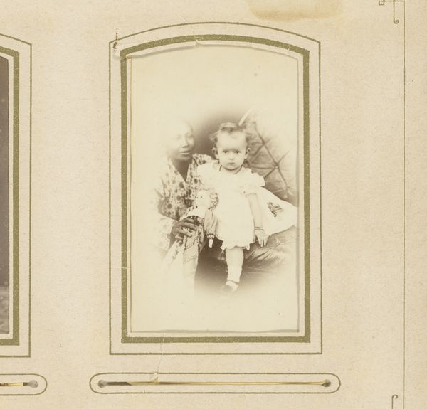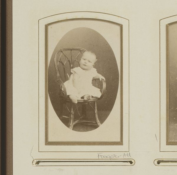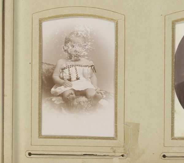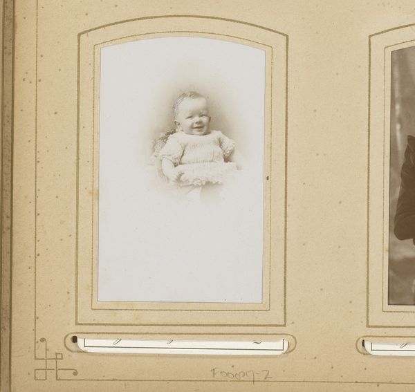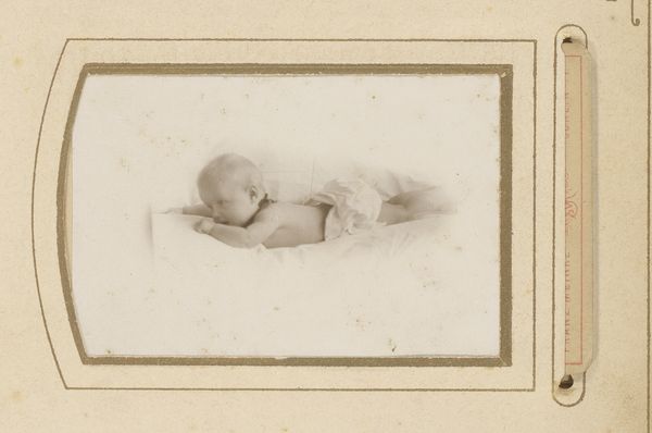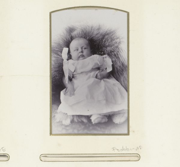 Editor: Here we have "Portret van Martin Gross als baby," possibly from 1894, created by Joseph Junk using a gelatin-silver print. The photograph has such a delicate feel. It's quite charming. How do you approach a piece like this, focusing on the form? Curator: The aesthetic quality derives from the relationship between light and shadow. Notice how Junk has used light to sculpt the face, giving volume and definition, and observe the high contrast of light falling on the lace, as if emphasizing its texture in an interplay with light, a key element in this gelatin silver print. What do you think that compositional focus suggests? Editor: I see what you mean. The details in the lace against the smooth skin are a great contrast. Is that a formal element the artist may be exploiting, given this piece falls into the portrait style? Curator: Indeed. The framing contributes too, doesn't it? How the curve at the top mirrors the roundness of the face, almost isolating the baby within an idealized space? Do you agree it elevates the portrait beyond mere representation? Editor: Absolutely! It feels very intentional. Focusing on the line, form and tonal scale gives me a whole new appreciation. Thanks! Curator: And observing your response has brought me fresh insight, too.