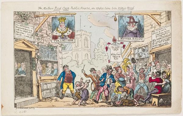 Editor: This is Thomas Rowlandson's "Portsmouth Point." It's a print, and it looks incredibly chaotic! What do you see in the way it's composed? Curator: Indeed, the print presents a dynamic visual field. Note how Rowlandson employs a horizontal format, yet populates it with a multitude of figures, each rendered with energetic, almost frantic lines. Editor: So, the lines themselves contribute to the feeling of chaos? Curator: Precisely. The artist's use of line, color washes, and spatial arrangement guides our eye, yet refrains from offering a singular focal point. What is your impression of the buildings at the margins and the mass of ships in the background? Editor: I see! The buildings seem to frame the scene while the ships mirror the crowd’s busyness. I’ll definitely look at prints differently now. Curator: Hopefully you now see how a focus on formal elements yields insight.