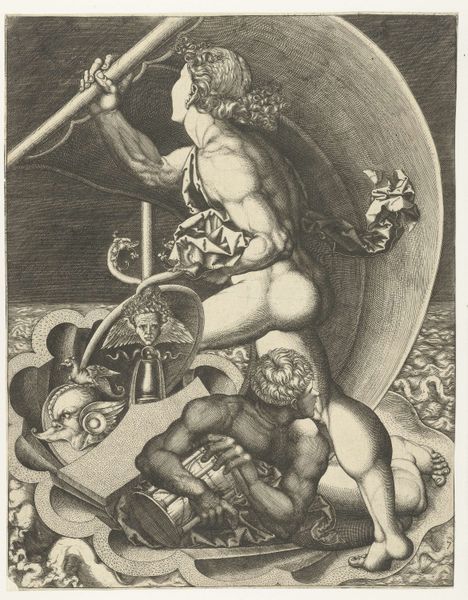 Curator: This is "The Fall of Phaeton," a sheet measuring approximately 41 by 27 centimeters currently held in the Harvard Art Museums. Editor: The immediate sense is one of chaos – a tumbling figure, horses in disarray, and a sky ripped open by streaks of light. Curator: Indeed. Caylus, the artist, captures the dramatic moment when Phaeton loses control of the sun chariot, a tale rich with allegorical interpretations regarding ambition and hubris. Editor: And the technique! Look at the cross-hatching, the way the lines build volume and suggest a dynamic sense of movement. It's fascinating. Curator: These tonal variations and the deliberate use of line communicate a very specific cultural understanding of tragedy. The engraver is not just illustrating a myth; he is invoking ideas of political order and divine retribution. Editor: I’m struck by the artist’s ability to convey such a sense of pandemonium within this relatively small frame. It speaks to the power of carefully controlled composition. Curator: It prompts reflection on the consequences of unchecked aspiration, rendered with remarkable technical skill. Editor: Yes, and how the artist's choices heighten the emotional impact. It's a potent combination of skill and narrative.