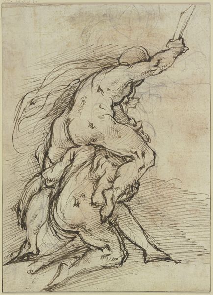Master F.P.’s "Woman Carrying a Tray," made around the mid-16th century, presents a figure rendered with a stark, linear intensity. The composition, dominated by dense cross-hatching, gives a sense of depth and shadow, almost obscuring the woman beneath a whirlwind of drapery. Observe how the artist uses line to define form and motion, creating a dynamic interplay between the subject and the surrounding space. The fabric, swirling around her, does more than just clothe her; it suggests movement, a fleeting moment caught in the rigid lines of the engraving. This piece seems to question the stability of identity, suggesting a more fluid, almost chaotic state of being. Consider how the limited tonal range and the etched line work, usually reserved for structure, instead serve to destabilize conventional representations of the human form. The print challenges us to look beyond the subject matter and recognize the power of the medium itself. It's not just what is depicted, but how, that communicates meaning here.