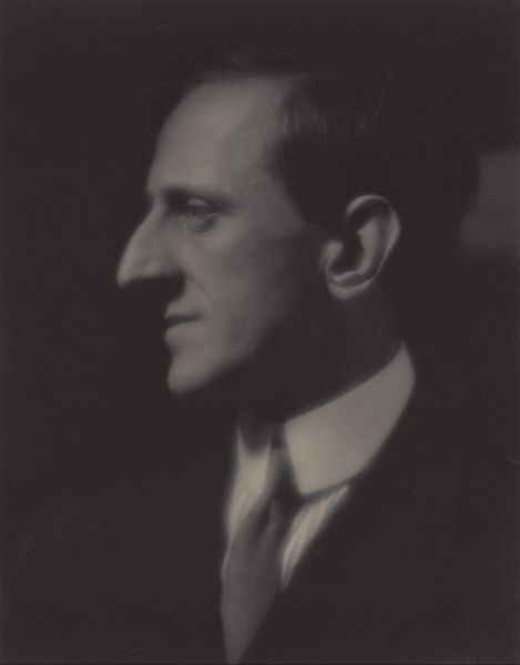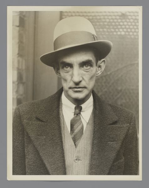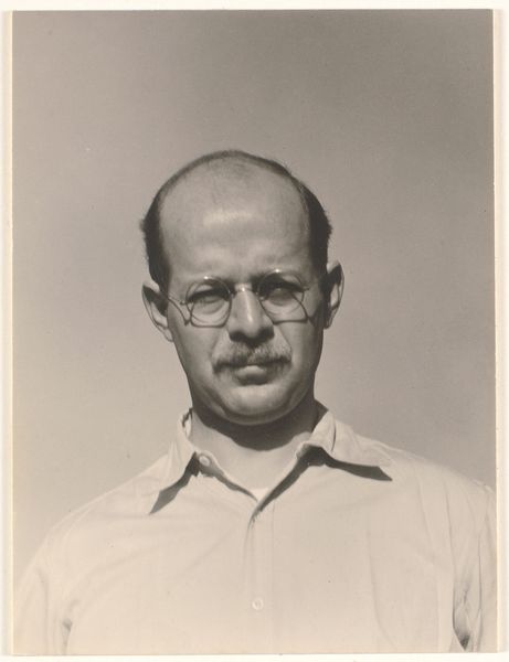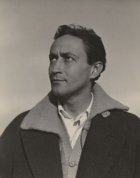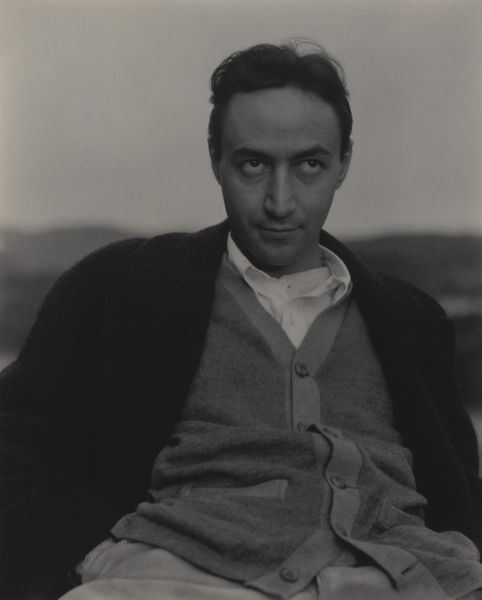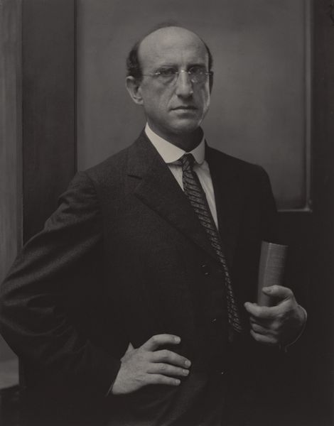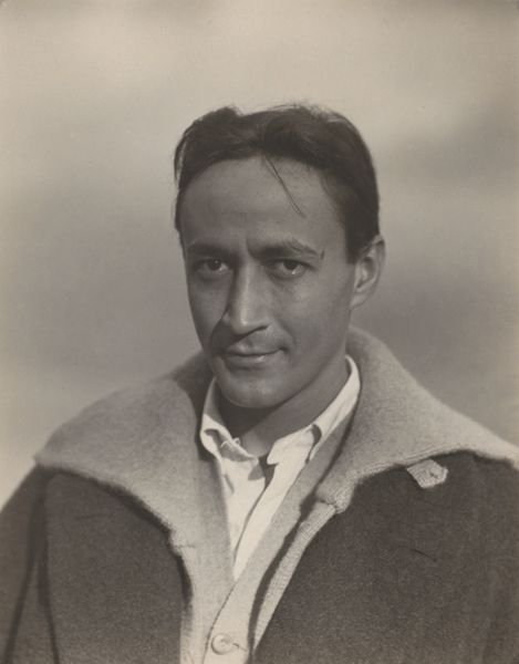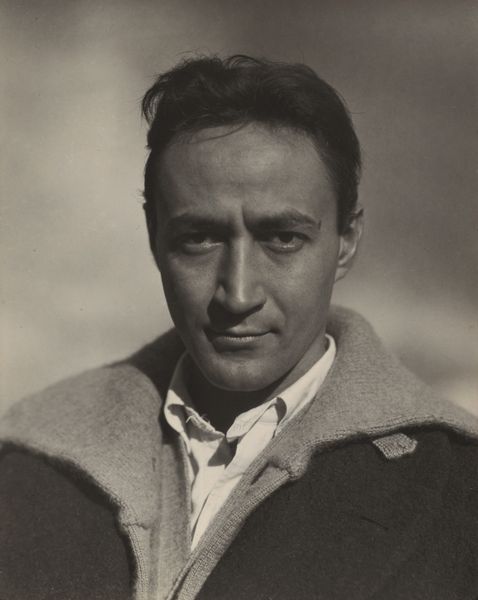 Editor: So, this is Alfred Stieglitz’s "Louis Kalonyme" from 1932, a black and white photograph. The subject's direct gaze is really striking. What narratives do you find present in this portrait? Curator: It's important to consider Stieglitz's relationship to the modernist project. The straightforward gaze could reflect the modernist desire for truth and clarity, a rejection of Romantic idealism, but truth for whom, and at what cost? Think about the context of 1932 – the Depression era. How does the starkness of the portrait speak to or perhaps avoid, the socioeconomic realities of the time? Editor: I see what you mean. It's interesting to consider the context alongside the image. I was just focused on the artistic elements, but how might Kalonyme, as the subject, be participating in the creation of the photograph's meaning? Curator: Exactly! The power dynamic inherent in the artist-subject relationship is always critical. Kalonyme’s posture, his clothing... they aren’t accidental. What could his pose communicate about his social position, his sense of self, and the identity he wishes to convey to the world during this time? Does it echo similar portraits or does it make a statement? Editor: I hadn't thought about that. I suppose I was thinking of the artist and artwork separated from their place in time, like it exists in a vacuum. This makes me think about art very differently, as a kind of conversation. Curator: Precisely! And whose voices are included in that conversation and whose are missing? Keep asking those questions. They're fundamental to understanding art's role in shaping our perceptions and identities. Editor: This has given me a new lens for viewing art and a new level of curiosity about each work’s narrative. Thank you. Curator: It's about seeing beyond the surface, understanding the complex layers of history, power, and representation that shape our visual world. A continued analysis enriches the experience.