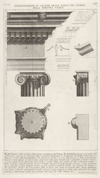 Editor: This is "The Roman Antiquities, t. 4, Plate XXXV. Great Vista of some of the first order of the Doric of the Theatre of Marcellus" by Giovanni Battista Piranesi, an etching that seems to be a technical drawing of architectural elements. It's striking how precise and detailed it is. What do you see in this piece? Curator: This print operates on many symbolic levels. Notice how Piranesi meticulously documents the Doric order, reflecting a deep engagement with classical ideals. He revives this "ancient" language of forms. But what happens when the present is obsessed by past glories? Editor: You mean that, in Piranesi's time, Rome was both modern and ancient at the same time? Curator: Precisely. The weight of history becomes palpable. It’s not merely a technical drawing; the rigid order also carries cultural memories and a latent melancholy. The engraving freezes time. Can you see how each component speaks to cultural authority and continuity? How do you read this tension between revival and stagnation? Editor: Now I see how the drawing style conveys a lot: while the geometry evokes perfection, its obsessive precision almost seems… anxious? Curator: Yes, I agree. The perfectibility is almost intimidating. But if the ruin already exists in perfect rendering, is this technical precision trying to control that historical loss? Perhaps. What feelings remain with you when looking at the totality of the image? Editor: The combination of precision and decay, I guess… The visual language becomes richer once you recognize those emotions locked inside. Curator: Absolutely. Visual language evolves. By looking at the "symbol" of ruins with that language, perhaps the original intention can persist beyond decay. A great paradox that speaks through time.