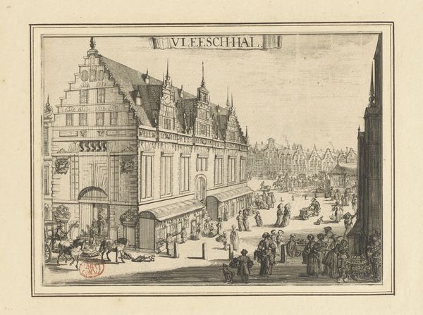 Editor: Here we have Poul Isac Grønveld’s “Frederik V’s Æresport i Randers,” an engraving from 1749, housed at the SMK. It depicts a city gate, bustling with figures. I find it interesting how it frames not just a space but also a particular moment in time. What strikes you when you look at it? Curator: The triumphal arch is more than just architectural; it’s a potent symbol of power and legitimacy. The "FS" monogram dominating the archway obviously points to Frederik, but consider the entire composition. The arch, adorned with classical motifs and a prominent crown, echoes back to earlier arches dedicated to the Roman emperors and their imperial ambition and right to rule. Editor: So it's consciously connecting Frederik V to that lineage? Curator: Precisely. The gate doesn't merely welcome a king, but invokes continuity and shared cultural identity across centuries. Consider too, how the very detailed architecture contrasts with the rougher rendering of the crowds. Why depict buildings precisely and people less so? Editor: Perhaps the buildings and monuments represent enduring power, while people embody ephemeral support that can change with time? Curator: That's insightful! By contrasting the ephemeral and the enduring, this work prompts reflections on kingship, loyalty, and memory. What symbols remain relevant? What fades from the collective conscious? This isn't just a cityscape; it’s a statement about how rulers sought to construct their image for both present and future audiences. Editor: I hadn’t considered it that way. I was so focused on the visual details that I missed the deeper message it conveys about cultural memory. Curator: Exactly, seeing historical symbols re-emerge allows us to better understand what we value in contemporary society.