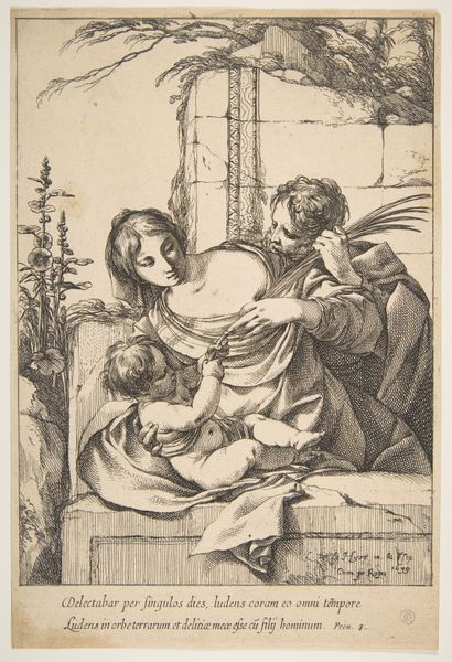 Editor: This is Anton Maria Zanetti the Elder's "The Virgin and Child with Saint John the Baptist," made sometime between 1717 and 1727. It's an engraving, so a print, and the tones of red and grey give it a really distinctive look. The scene itself, though, it's surprisingly static, almost frozen in time. What's your read on this piece? Curator: Well, first, let’s bask in the glory of Baroque drama filtered through Zanetti's quirky sensibility! Forget sentimental Madonnas; this Virgin seems less ethereal, more like a Roman matron posing with cherubic props. And that temple backdrop? It is less about piety and more a stage set for a historical drama. Do you see how the use of color enhances the mood of antique theatricality? It reminds me a little of plays that are revived in unexpected settings. It creates a world unto itself. It makes you ask what Zanetti is up to. Editor: The theatrical comparison makes total sense. It almost feels like a scene from an opera. I'm wondering about the original it’s based on and the odd color choices for an ostensibly religious piece. Curator: That’s the beauty of it, isn’t it? It's not *just* a religious piece; it's Zanetti playfully engaging with art history, remixing classical and sacred themes. Think of the Baroque like a magpie's nest – bits of everything sparkling together! Maybe he wanted to show how the themes we return to again and again still resonate for us, no matter the presentation? Or he simply liked to show off! Editor: I see that, like he’s layering references, using religious imagery to play with classical ideas. It gives me a whole new appreciation for Baroque art, seeing the wit and creativity at work. Curator: Precisely! It is a constant negotiation. What was sacred is constantly being recontextualized. Always keep looking; things aren't always as they appear.