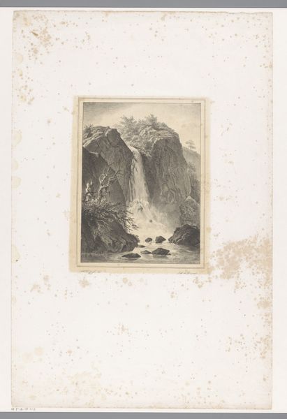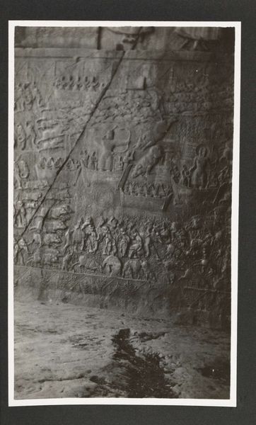 Curator: Gerrit Hubers created this gelatin-silver print sometime between 1894 and 1927. The title suggests it’s called "Rotsblok met opschrift, vermoedelijk een gedenksteen", or “Boulder with inscription, presumably a memorial stone.” Editor: It gives off such a solemn feeling. That weathered stone seems so ancient. Curator: It does evoke a sense of the past. The inscription hints at its purpose—perhaps it marks a significant historical event or commemorates a person. Editor: You know, looking closer, the inscription is barely legible; the stone looks so rough. The act of carving letters into such an intractable material must have required an incredible amount of labor. Did that stone come from somewhere special? Curator: Possibly a locally sourced material, connecting the monument directly to the region's geological and cultural identity. Memorials like these often serve as focal points, solidifying community identity. It is presented to us as a Realist and landscape style artwork through photography. Editor: Do you think that inscription was carved quickly out of need or carved and created precisely as a carefully thought and placed project for remembrance and legacy? I find that material is an integral communicator of memorial culture. Curator: Interesting question. The stone's realism and unidealized nature probably played into creating a permanent place in memory as well, creating a social landscape out of materials. Editor: The thought and skill necessary to manipulate that material shows the value of how we communicate permanence or ephemerality of ideas or of people in relationship with nature, even within something as solid as stone and a simple inscription. Curator: A beautiful point. I see it as a document of a moment, capturing not just a physical object but the social and historical context surrounding it. It gives the viewer a view of a bygone world with the impact still here. Editor: Exactly! Thinking of the people, time and the location that brings everything together offers insights to memorial art production we would have never discovered without seeing all together.