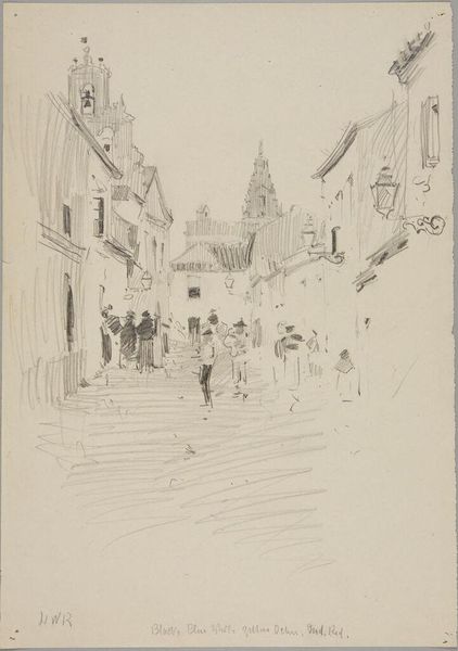 Editor: This pencil drawing, "Gezicht op de Heiligeweg te Amsterdam" by George Hendrik Breitner, dates back to around 1893 and captures a bustling Amsterdam street. I'm struck by the energy it conveys, despite being a seemingly quick sketch. How would you interpret this work? Curator: Breitner, known for capturing the spirit of everyday life in Amsterdam, presents us here not just with a street scene but with a social document. It's important to understand the historical context: Amsterdam in the late 19th century was a city undergoing rapid industrialization and social change. How does this sketch reflect that transformation? Editor: I guess you can see that in the figures hurrying along the street; they don’t seem to be posing, but actually caught in a real-life situation. But it is a simple pencil sketch, why not a photograph? Curator: Exactly! While photography was emerging, sketches like these offered something different: a subjective impression, an artist's interpretation of the changing urban landscape. Breitner chose to focus on the dynamism, the transient nature of modern life, didn't he? He shows the city, but perhaps also his view of social mobility? Consider how institutions like art academies shaped the appreciation and understanding of cityscapes, and in turn shaped artists' approach. Editor: So, this isn’t just a drawing of a street; it’s about capturing a specific moment in Amsterdam's social and cultural development? Curator: Precisely. It reflects how art engaged with, and helped shape perceptions of, urban modernity. By focusing on a seemingly ordinary scene, Breitner elevates it to a commentary on his time. The fact that it’s a drawing also impacts how we look at the piece. We, and he, have made a conscious decision to see beauty in a fleeting sketch rather than a staged formal depiction. Editor: I see. It makes me think about how our current snapshot aesthetic has origins that go back much further than phone cameras! Curator: Exactly. Art doesn't simply reflect society; it actively participates in constructing our understanding of it.