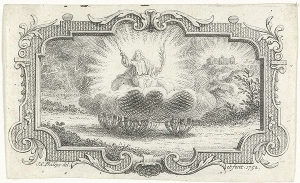 This etching, "Overstroomd Landschap," was created by Jan Caspar Philips around 1741. The eye is immediately drawn to the contrast between the chaotic floodwaters and the classical frame adorned with allegorical figures. Philips uses linear precision to depict the devastation. See how the diagonal lines of the waves and the tilted boat create a sense of instability. The architectural frame, a structure of order and reason, is juxtaposed with the disordered natural world, destabilizing the viewer's sense of security. This tension isn't just visual, it reflects a philosophical unease. The flood isn't just a natural event but a sign, an allegorical disaster disrupting the ideals of the Enlightenment. Consider how the etching functions as a semiotic system. The boat is a signifier of human vulnerability, the church steeple represents the threatened spiritual order. The lines of the etching, therefore, become more than descriptive; they are encoded with meaning.