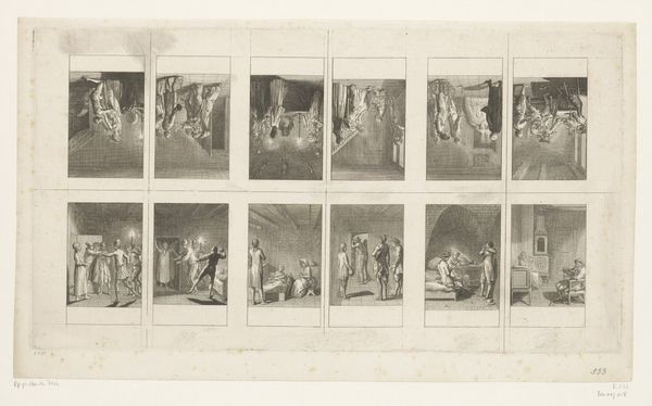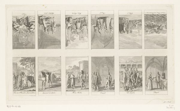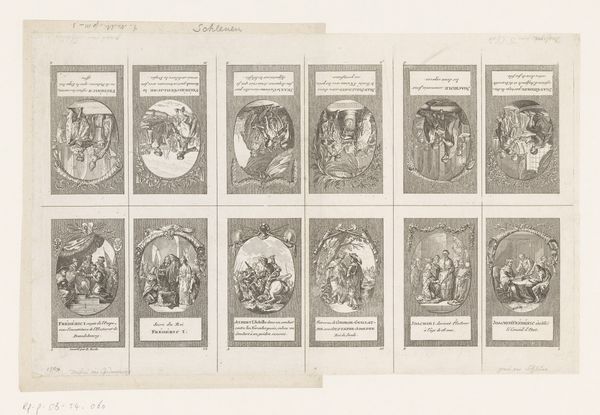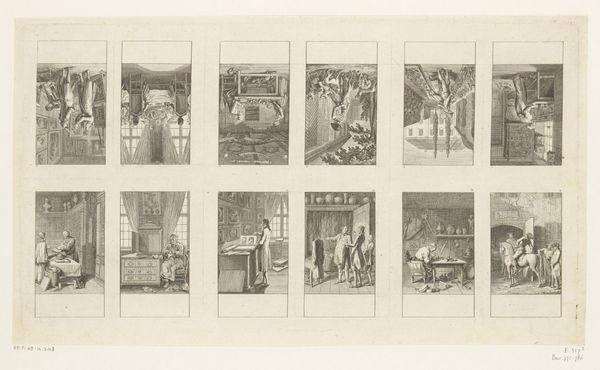 This is Daniel Nikolaus Chodowiecki’s ‘Twelve performances with activities for ladies’, an engraving on paper, now held at the Rijksmuseum. At first glance, the composition is striking—twelve individual scenes meticulously arranged, each offering a glimpse into the lives of women. The artist has used a simple monochromatic palette, achieving a remarkable range of tones through delicate lines and shading. Each scene, framed within its own rectangle, creates a sense of order, yet the variety of activities disrupts any notion of uniformity. Chodowiecki masterfully employs the engraver's line to define forms and capture subtle nuances of expression and setting. The cross-hatching and stippling techniques add depth and texture, inviting us to examine the social constructs and gender roles of the time. The artwork’s structure prompts us to consider how these activities collectively define women's roles in society, engaging with contemporary debates about gender and representation. As you move on, consider how Chodowiecki uses the formal constraints of printmaking to make a powerful statement about eighteenth-century life.