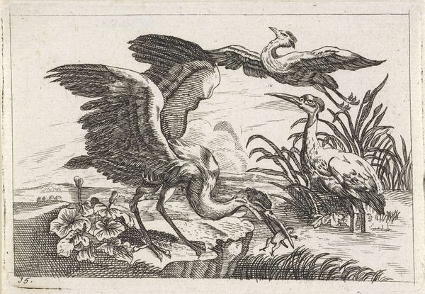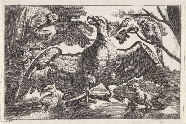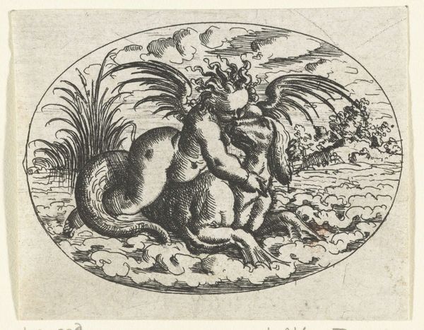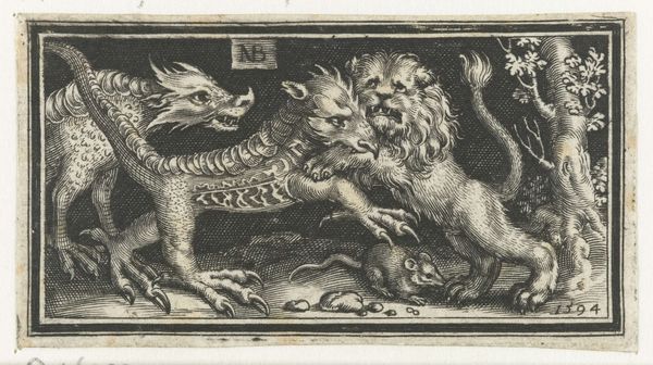 Curator: Antonio Tempesta's engraving, "Een draak jaagt andere dieren weg," created around 1600, presents a scene of chaos. My initial impression is how unsettlingly alive everything seems, despite being rendered in stark lines. There’s a real sense of panicked movement. Editor: Absolutely, the dynamic composition immediately grabs you. I am interested in the dragon itself; how Tempesta structures it with such assertive lines that it immediately occupies the viewer’s focus and evokes feelings of danger and power. Tell me more about the overall symbolic structure here? Curator: Well, on a purely visual level, observe the use of diagonals, creating a sense of instability. The contrast between light and shadow amplifies the dramatic effect, leading our eye around the composition, chasing after those fleeing creatures. And don’t overlook the Latin inscription at the bottom—'VBI ADSVM VITIOSA ABSVNT’ Editor: Ah yes, “Where I am, vices are absent.” That shifts things considerably. Given the era, this isn’t just about aesthetic qualities or the beauty of linear technique; it reflects contemporary social and moral anxieties. It seems the dragon serves as an enforcer of morality, chasing away vice represented by those fleeing animals and figures. But is the dragon benevolent or just another form of oppressive power? Curator: It's this ambiguity that fascinates. Note how the dragon, rendered with painstaking detail, becomes this compelling figure – terrifying yet fascinating. The textures, achieved through careful hatching and cross-hatching, contribute to a visual intensity that demands attention, no matter how complicated the symbolic context becomes. The animals, by contrast, are only partially delineated, enhancing that chaotic movement that you recognized straight away. Editor: Precisely. I find this speaks to ongoing debates about who gets to define virtue, and who is punished. Considering Tempesta’s background, were these notions being influenced by religious reforms or local political disputes? Or perhaps wider tensions present within colonial dynamics. Curator: These are pertinent questions for contextualising the work, and seeing as it remains open to multiple interpretations and engaging on many levels, perhaps we are looking at an enduring emblem for debate and reflection. Editor: Indeed. The dragon seems poised to ignite ongoing discussions about power, morality, and our anxious relationship with both, hundreds of years later.