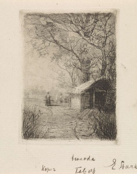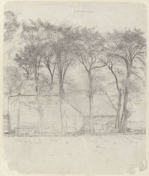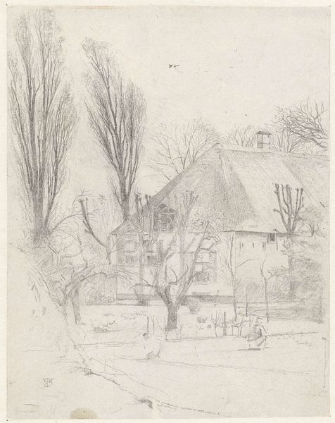 Editor: We’re looking at Gerrit Willem Dijsselhof’s "Boerderij bij Velzen", a pencil drawing created sometime between 1876 and 1924. There's a delicate, almost ghostly quality to it, and I'm immediately drawn to the bare trees framing what looks like a farmhouse. What captures your attention when you look at this piece? Curator: It's the stillness, isn't it? Like a whisper from a time long past. I find myself drawn to the starkness of the branches against what feels like a soft, grey sky. Dijsselhof wasn't just capturing a farmhouse; he was, in a way, capturing a mood. Do you notice how the almost casual strokes of the pencil still convey depth and volume? He wasn't afraid to leave some areas vague, trusting the viewer to fill in the blanks. Editor: I do. It almost feels unfinished, but intentionally so. Like a half-remembered dream. Do you think the sparseness adds to the sense of realism, in a way? Curator: Absolutely! The sketch’s unfinished appearance enhances realism by capturing fleeting impressions and the inherent impermanence of life and memory. This method encourages viewers to project themselves into the scene, contributing to its story, almost making it alive again, which would be lost with photorealistic depiction. There's a conversation happening between the artist and the viewer. We’re not just observing; we’re co-creating. Editor: That’s fascinating! I hadn’t thought of it that way. It’s like he’s inviting us to complete the memory. I definitely see this differently now. Curator: Precisely. Art is often about the unspoken dialogue, wouldn't you agree? It’s a gentle nudge towards introspection, inviting us to reflect on our perceptions and find echoes of our own stories within its delicate lines. It almost doesn't get better than that.