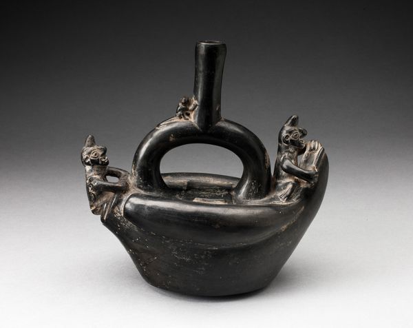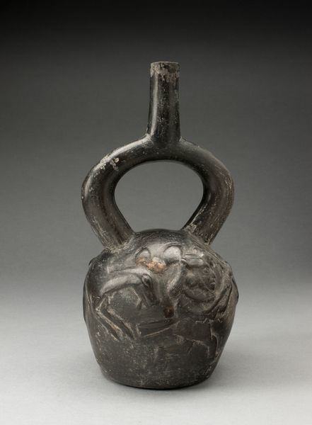 This blackware stirrup spout vessel with incised squared spiral motif was created by the Chimú people in ancient Peru. The Chimú were skilled in pottery. Their work often reflected their worldview, social structures, and daily life. This vessel, with its distinctive stirrup spout, represents an important feature of Chimú art. The squared spiral motif incised on the surface may symbolize concepts related to water, agriculture, or cosmology. Its significance would have been immediately legible to members of Chimú society. The vessel's blackware finish, achieved through specialized firing techniques, would have added to its allure. We know that it may have served a practical purpose for storing liquids. It may also have been used in ritual contexts. Understanding the symbolism and cultural context of Chimú pottery requires interdisciplinary research, drawing on archaeology, ethnography, and art history. By studying such objects, we gain insight into the beliefs, practices, and artistic achievements of the Chimú civilization, and we can appreciate the role of art in shaping social identities.