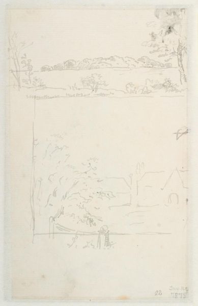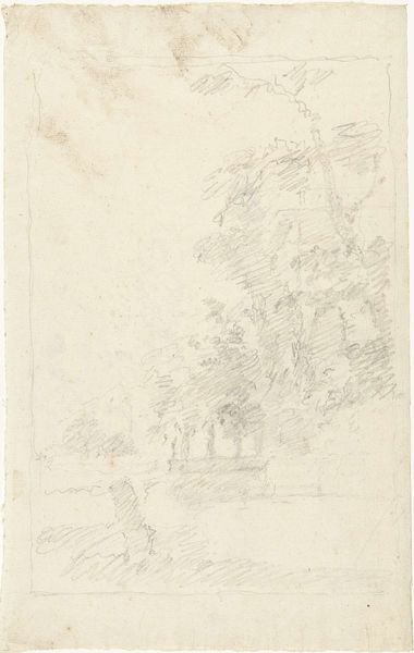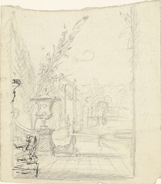 Curator: This is “Two Sketches of a Garden Landscape” by Dionys van Nijmegen, dating from the late 18th century. It’s rendered in pencil on paper. Editor: My first impression is one of delicate serenity. The light pencil strokes evoke a dreamlike quality, almost like a fleeting memory of a garden. Curator: It's interesting to consider the availability of paper and pencils during this period. Van Nijmegen, being part of the artistic circles influenced by Neoclassicism, had access to these materials through burgeoning trade networks, marking a shift in artistic production and the rise of preparatory sketches. Editor: Yes, and the composition itself – the division into two distinct scenes, each with its own focal point – it leads the eye on a specific journey. Notice how the artist utilizes framing with trees and architectural elements? Curator: Absolutely. And the very act of sketching—quick, informal—reflects a shift in the artist's role. It becomes less about commissioned masterpieces and more about exploring ideas, capturing the fleeting beauty of a landscape. Was the paper handmade, laid, or wove? What was the artist trying to create and where did he get his supplies? Editor: The lack of detail also contributes. These aren't polished, finished works but more suggestions, which pulls us in, lets us fill in the blanks and construct our own imagined spaces. The weight and arrangement create balance as we perceive these structural spaces. Curator: The formal gardens represented hint at the social context of the time. Landscape design reflected hierarchies, a controlling hand over nature—something Neoclassicism celebrated but which also began to be challenged as industrialism impacted land and lives. These sketches become documents of land use. Editor: But even within that control, the sketches themselves breathe. The way the pencil dances across the page—you sense the artist's hand, their quick observations. Curator: Indeed, this glimpse behind the scenes reminds us that the artistic process and access to its components – pigment, supports, patrons – are just as much a part of the art as what’s visibly depicted. Editor: Precisely. It really changes the experience once you've peered beyond what first catches the eye. It offers a greater and greater respect to the artistry as time goes on.