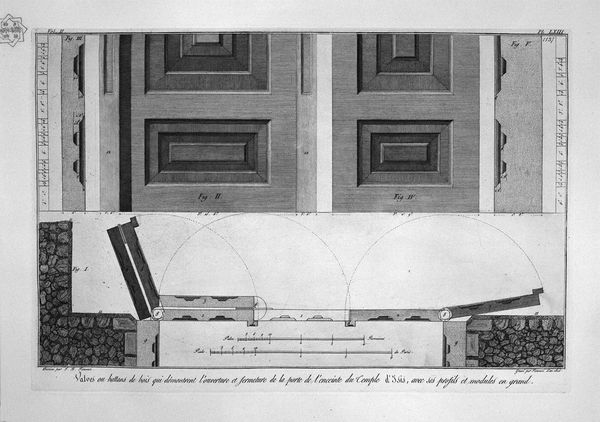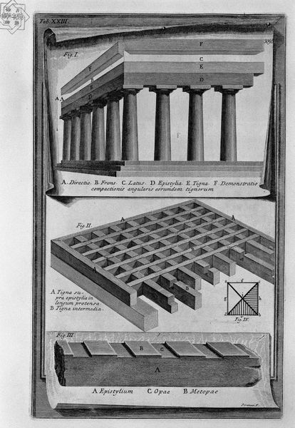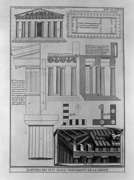 Giovanni Battista Piranesi made this etching titled 'Plan, elevation and details of Doric temples in Greece' after Le Roy. Piranesi’s print presents a visual deconstruction of classical Doric temples through a series of architectural plans and elevations. The composition is carefully arranged, contrasting the flat, graphic quality of the plans with the more detailed renderings of temple facades. The stark black lines against the white paper create a graphic tension, which is characteristic of Piranesi's style. Each line and shape serves as a signifier, pointing to a deeper understanding of architectural form and its cultural significance. The meticulous detail invites a semiotic reading, where each element—column, frieze, or capital—functions as a unit of meaning within the broader language of classical architecture. Piranesi challenges the viewer to reconsider fixed notions of classical beauty. The emphasis on structural elements and their interrelationships underscores the idea that architectural form is not merely aesthetic but also a complex system of communication.