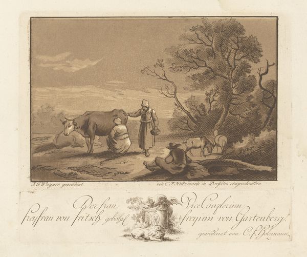 Editor: Here we have Thomas Rowlandson's "Doctor Syntax Sketching After Nature," created around 1815. It's a hand-colored etching and aquatint, quite charming. The scene feels almost theatrical, doesn't it? What social commentary do you see embedded in this seemingly simple landscape? Curator: That "theatrical" feel is key. Rowlandson was producing this during a period of intense debate about the role of art and the artist in British society. How should the landscape be depicted? For whom? And who has access to that depiction? The figure of Dr. Syntax, sketching while surrounded by bemused onlookers and indifferent livestock, is subtly satirical. Editor: Satirical in what way exactly? Curator: Consider the rise of picturesque tourism. People traveled specifically to *find* scenes worthy of painting or sketching, often romanticizing rural life. Rowlandson seems to be questioning the artificiality of this pursuit, the way the “picturesque” could become a performance for both artist and audience. Look at how Dr. Syntax is positioned, almost as a spectacle himself. Editor: I see your point! He's not just observing nature; he's part of a staged scene, and the social dynamics are central to understanding the work. It makes you think about who art is really *for*, doesn’t it? Curator: Exactly! And it prompts us to ask: is the landscape presented authentically, or is it being commodified and consumed? Rowlandson doesn’t give us easy answers, but that questioning is precisely the point. How did institutional forces affect the presentation of this art piece for consumption by the British public? Editor: This makes me realize I often look at art in a vacuum, but its meaning is so intertwined with the socio-political context. Thanks for this. I'm viewing art with new eyes today. Curator: And I’m pleased to learn of your refined view on Rowlandson's drawing.