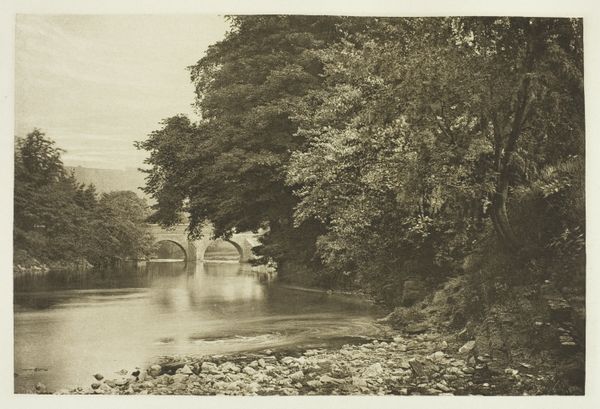 Editor: Here we have Peter Henry Emerson’s gelatin silver print, “Tissington Spires, Dove Dale,” from around 1880. It's a beautifully muted landscape. The rocks and trees lining the riverbank feel very serene and classically English. What strikes you most about this photograph? Curator: Well, what immediately stands out is how Emerson is situating himself within a very particular discourse around photography and art more broadly. He was a staunch advocate for photography as fine art. This image, like much of his work, is deliberately pictorial. Editor: Pictorial? In what sense? Curator: He employed techniques, like soft focus, to mimic the effects of painting and etching. Why do you think he might have chosen to emulate painting in photography’s early days? Editor: I suppose to legitimize it as an art form, to elevate it beyond just documentation? Curator: Precisely! Emerson was actively fighting against the perception of photography as purely scientific or documentary. He saw it as capable of conveying emotion, atmosphere, and artistic vision. Think about the broader cultural context of late 19th century England. Romanticism was still a powerful influence, with its emphasis on the beauty and sublimity of nature. This image aligns with that sensibility, wouldn't you say? Editor: I see that. So, this seemingly straightforward landscape is actually making a bold statement about photography's potential. Curator: Exactly. It's about asserting photography's place within the established art world, pushing boundaries and challenging conventions of his time. I wonder what impact Emerson has in contemporary photography? Editor: This has really made me think differently about photography from this period. Thanks!