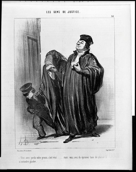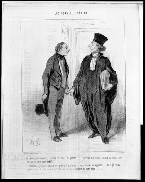 Editor: This is an intriguing lithograph by Honoré Daumier. It doesn't appear to be dated, but it's held at the Harvard Art Museums. It feels satirical. What do you see in this piece? Curator: The hunched figures of the lawyers, their faces almost predatory, connect to the cultural memory of legal professionals as opportunistic. Daumier uses the image to convey the psychological power dynamics at play, and asks, does their concern extend beyond monetary gain? Editor: It's interesting how the woman is positioned at a distance, almost like a symbol. Curator: Exactly. She embodies vulnerability, visually representing the emotional weight of her situation. The image lingers in the mind, suggesting a timeless commentary. Editor: I learned how symbols can carry so much historical and cultural meaning. Curator: And how artists like Daumier use them to speak volumes.