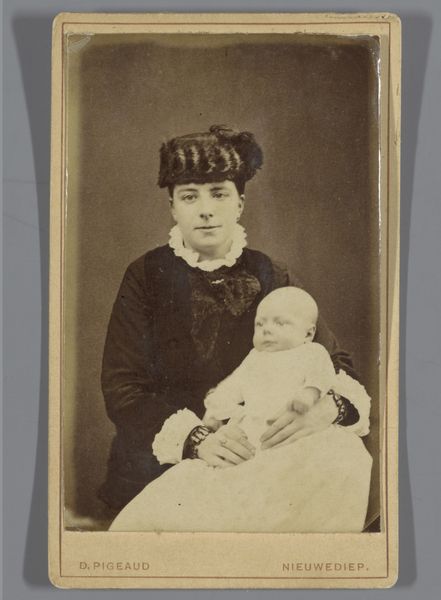Curator: Welcome. Before us is a fascinating albumen print dating from around 1864 to 1890, "Portret van een vrouw met een baby in een kinderwagen," attributed to Maurits Verveer, held in the Rijksmuseum. Editor: It's remarkably staged, isn't it? The somber sepia tones create a sense of studied formality, of an important occasion. The composition seems carefully calibrated. Curator: Indeed. Note the balance: the woman, elegantly posed beside a neoclassical-style pedestal, and the baby in the intricately woven pram below. It's a study in contrasts – the adult's composure against the child's almost sculptural repose. Observe the lines of her dress, echoed in the drapery behind. Editor: Yes, but let's consider that woven pram for a moment. The care in its construction, likely by skilled artisans. Albumen prints capture an interesting paradox – emerging industrialized photographic techniques immortalizing traditional craft practices in objects like that carriage. I wonder about its availability. Who was able to afford this kind of craftsmanship? Curator: The wicker certainly adds a textural element that contrasts beautifully with the smooth surface of the albumen print, the crisp detail rendering its intricate weave quite remarkable. Its circular form offsets the angular lines of the plinth rather wonderfully, I think. Editor: But beyond just "texture," the choice of wicker points to specific artisanal traditions and markets for such goods. This object gives so much information. Was that pram woven by a mother or father as they awaited their child, and what does this suggest about labor at the time? What kind of value do we place on these crafts in the same frame as new industrial achievements? Curator: Those layers of visual information build toward the central subject. If one looks closely at the woman’s face, at the almost imperceptible lines etched there. It evokes so much: familial duty, a hint of world-weariness maybe? The symmetry and balance direct the gaze straight toward her expression. Editor: The materiality of the photograph, with its limited tonal range, almost flattens emotion while presenting evidence. To consider how material and social circumstances converge here to fix the woman and child within constraints of class, posing both subjects for inspection, gives a sense of both immediacy and historical distance. Curator: A fascinating encapsulation of its era through compositional skill. Thank you for drawing out those intricate readings, Editor. Editor: An object, truly representative of the era's evolving landscape of both artistic media and artisanal industries. Thank you.