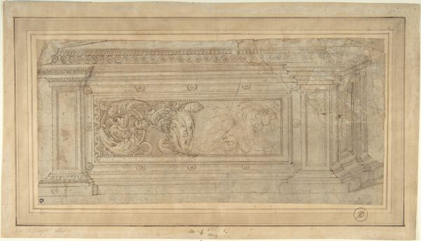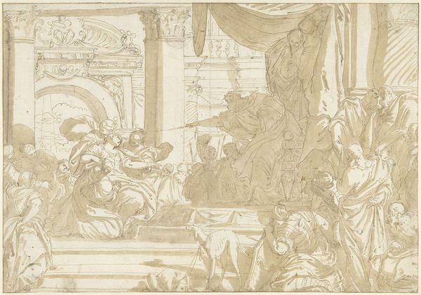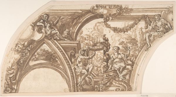 Editor: Sir James Thornhill’s "A Ceiling and Wall Decoration" is a whirlwind of figures sketched in brown ink. The dynamism is captivating! What do you see in this piece? Curator: This work speaks to the enduring power of classical mythology. Consider how Thornhill uses these figures - Neptune, gods in the heavens - to evoke ideas of power, divinity, and even national identity within the context of the British Baroque. Editor: National identity? How so? Curator: By associating Britain with the grandeur of classical civilizations, Thornhill subtly elevates its status. Think of how ceiling paintings in grand houses shaped perceptions. Editor: So, it's not just decoration; it's a statement. Curator: Precisely. Symbols can carry profound cultural weight, shaping how we see ourselves and our place in history. Editor: I never thought about it that way.