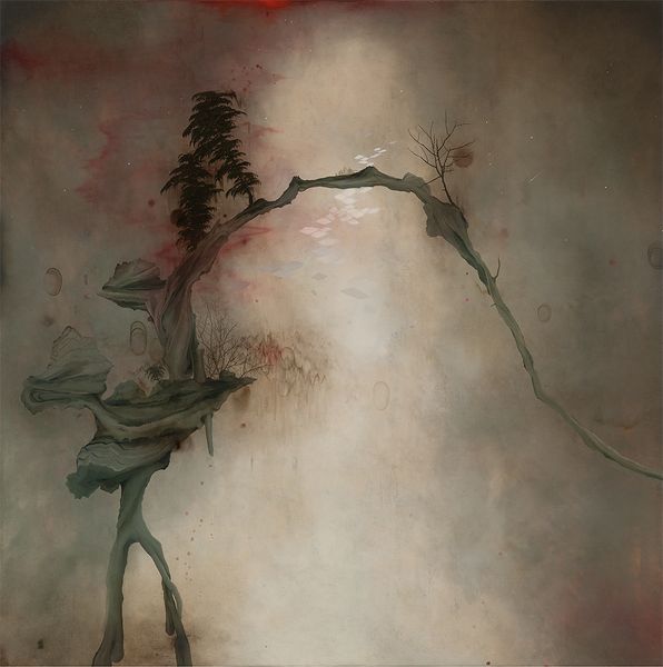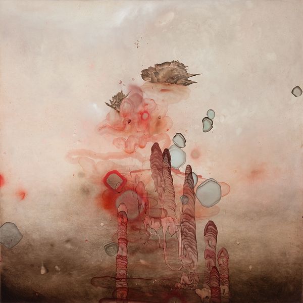 Curator: Darren Waterston’s 2012 mixed-media piece, “Locus Amoenus,” presents a rather unique approach to abstraction, doesn’t it? Editor: It’s dreamy, almost ethereal. I see cloudscapes, nebulae… It's captivating how the dark, amorphous shapes at the bottom ground the lighter, floating forms. It is somewhat evocative of Chinese landscape painting tradition. Curator: The title is definitely a good starting point here. Locus Amoenus refers to a classical, idealized landscape—a serene, sheltered place. In terms of material consideration, Waterston mixes acrylic paint and watercolors here to evoke a liminal space of the natural environment that might also extend to an imaginary landscape. I see Waterston’s fascination with layering techniques, pushing paint's liquidity. The way he uses the medium—those pools and washes—speaks to process over precision. Editor: That sense of idealized space is spot on! And those bottom shapes – look almost like darkened isles, the kind of land masses you'd see represented on medieval maps indicating places beyond, full of the unknown, of fearsome imaginings of monsters and demons lurking about. Curator: Interesting interpretation, especially when we think about classical myths placing monsters into similar settings. It strikes me that in using these acrylics and watercolours in the way he has, Waterston is consciously breaking down the old hierarchy separating 'high art' in the form of fine art and 'lower' forms of artistic and craft based expression such as illustration and map making. How can we truly divorce fine art, supposedly made for the upper classes from more quotidian or workaday expressions of image production? Editor: Precisely! The layering creates this veil-like quality; obscuring, hinting, rather than dictating what we see. And there are celestial spheres depicted, with constellations. "Locus Amoenus" it could be argued, implies the macro and micro dimensions of nature: perhaps how internal psychological landscapes also contain projections of 'outer' space in dreams. It hints at alchemical pursuits... perhaps inner transformational work is alluded to here. Curator: I agree; his playful layering blurs boundaries. Through this process he also makes comment on the increasingly thin and quite frankly, fairly meaningless lines separating artist, craftsman, designer. What else? Editor: Thinking about it now, the painting invites us to question the difference between objective, observable natural forms versus how those forms manifest as cultural symbols through our subjective, inner worlds. The artist uses archetypal forms to give viewers something oddly familiar... a world both 'of' this world, but distinctly not. It hints at somewhere sacred and fundamentally unknowable. Curator: Beautifully said. It leaves us wondering, doesn't it, about the physical labour and techniques employed and also how, psychologically, cultural memory and visual symbols shape perception? Editor: Indeed! The layering creates such a beguiling piece. A testament to his methods but also the historical symbology implied, don't you think?
