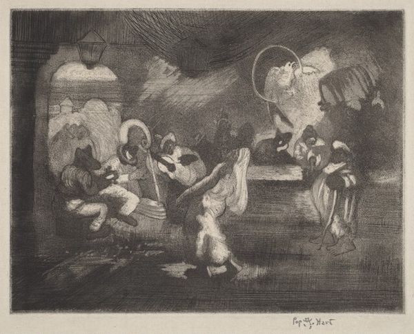 William H. Holst created this print, "Fan Dancer," sometime during his career, which spanned much of the 20th century. In a work like this, Holst is in dialogue with a long history of representing the female body for a predominantly male gaze. Here, he depicts a burlesque dancer, a figure often associated with both allure and exploitation. What does it mean to frame this performer in front of an audience that seems almost entirely composed of men, in what looks like a private room? The men are drinking and smoking, their faces a mixture of expectation and boredom. The dancer herself, caught in a moment of performance, is both the center of attention and seemingly disconnected from the scene's overall mood. Holst invites us to consider how performance, gender, and class intersect, and how the act of looking can both empower and objectify. The emotional complexity here leaves us contemplating the dynamics of power and the role of the artist in portraying these interactions.