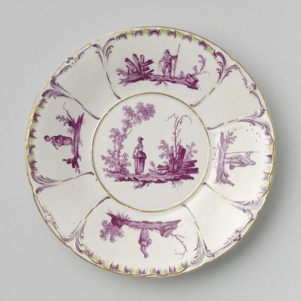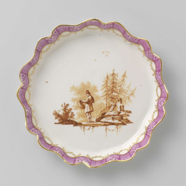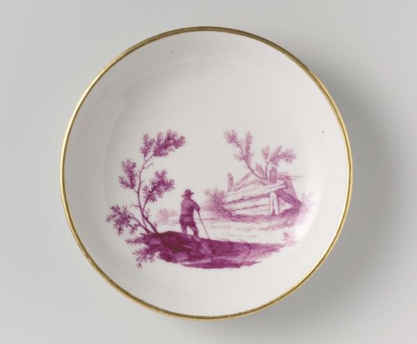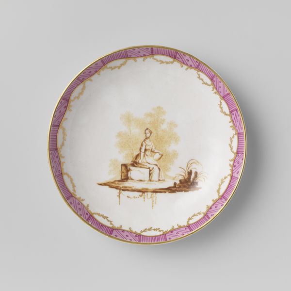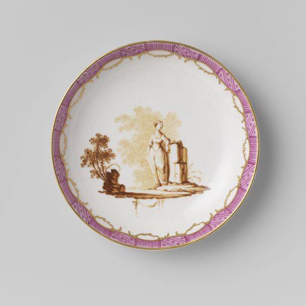 Curator: Here we have a delicate saucer created in Ansbach around 1785. The artist rendered this miniature scene in tempera on ceramic, showcasing a charming, Rococo sensibility. Editor: It's simply enchanting, this little world within a dish! There’s an ethereal quality to the soft purples and that gilded rim really pops. I almost expect it to float away. Curator: The image certainly captures the lightness of Rococo. At its center we find a putto perched upon mauve-tinged clouds. It appears he is intently studying a miniature artwork. Editor: Oh, meta! An artwork within an artwork. And the figure looks to be nude – cupid is so exposed – are there implications about truth and transparency in image-making at play here? What message would this plate have served its owner? Curator: Possibly, but remember this piece exists within a broader Rococo aesthetic. These mythological, often allegorical, depictions were hugely popular and often leaned into playful sensuality. Cupid as an emblem represents earthly, physical, and passionate love and was favored amongst nobility at this time. Editor: Right, Rococo does love its frills and frivolous subject matter! Thinking about the context in which something like this would have been enjoyed--in court society, display mattered. Something so beautiful elevates an object into a kind of conversation piece or a token. How might tableware function in court society as a site to show off wealth? Curator: Tableware during this period served as much more than functional objects. They acted as markers of taste and status, becoming powerful indicators of refinement and wealth. Imagine such a porcelain collection displayed as a form of one's cultivated identity. Editor: So this saucer, in its own way, becomes a tiny stage for social performance. A tableau reflecting and reinforcing particular cultural values, whether about class, love, beauty, or what was deemed appropriate imagery. Curator: Precisely. The beauty, symbolism, and history of these objects enrich our understanding of past societies. Editor: It truly provides a glimpse into the artful constructions of self and society through seemingly simple objects.