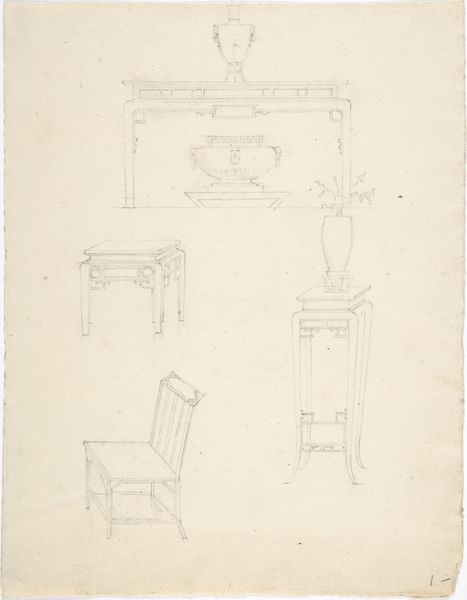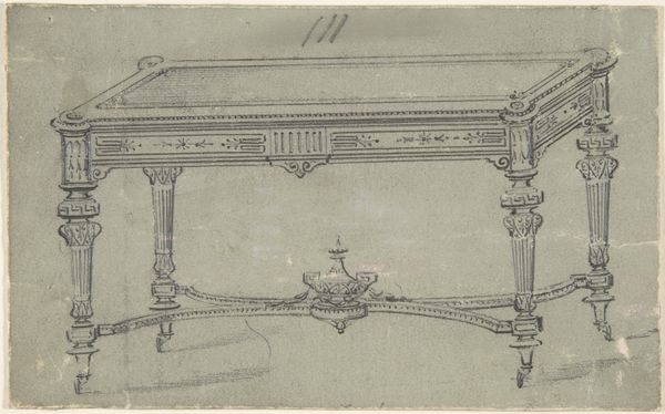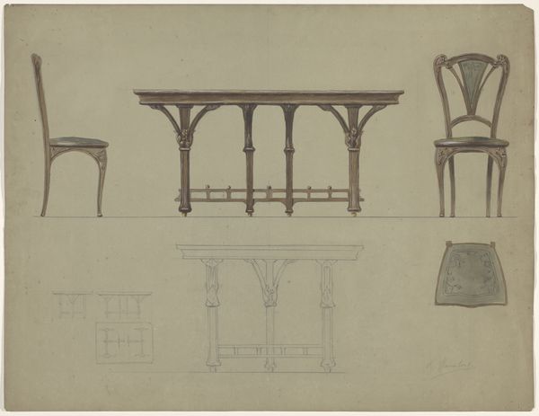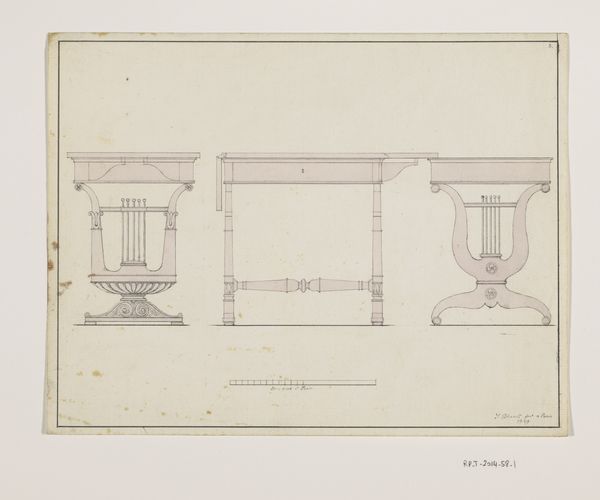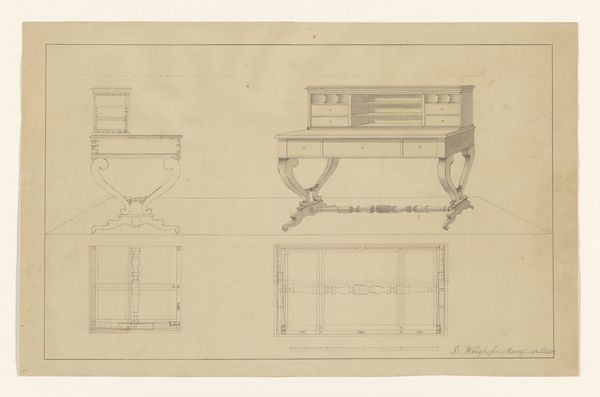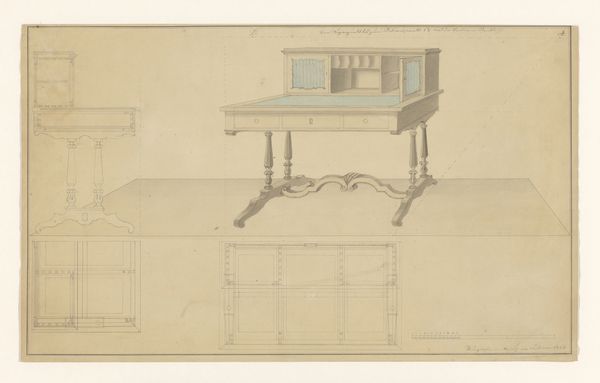 Editor: This is "Ontwerp voor een uitklaptafel met zijaanzicht en plattegronden onder beide aanzichten," or Design for a folding table with side view and floor plans below both views, from 1851, created with pencil on paper by B. Winghofer. I find it fascinating how it combines artistic representation with technical design. What elements of its visual structure stand out to you? Curator: The immediate feature that grabs my attention is its almost scientific presentation. The rendering possesses a stark linearity and precision, indicative of a functional blueprint rather than an artistic indulgence. Notice the stark contrast between the ornate, almost Baroque legs of the table and the orthogonal lines dictating its structural dimensions. Does this interplay suggest anything about form versus function? Editor: It highlights a tension, certainly. The decorative flourishes seem almost at odds with the drawing’s geometric, utilitarian purpose. But it also suggests a desire to integrate artistry even into the most practical of designs. What is your understanding of the semiotics involved here? Curator: The piece can be read as a semiotic puzzle. The "table," or signifier, represents domesticity and function. But Winghofer complicates this signifier with intricate carvings. The sign itself is, therefore, both practical and ornamental. What does that ornament communicate in this piece? Editor: Maybe a sense of status or aspiration? The ornate details might suggest a desire for elegance and refinement, even in an everyday object. Looking at the broader picture, the artist’s signature almost becomes a graphic element within the drawing. Curator: Precisely. Its integration suggests a blurring of artistic and functional boundaries, reminding us that every design choice is also an act of authorship and artistic expression. In conclusion, how do the different components of the drawings – technical drawing and illustrative elements – convey the artist's intentions and aspirations? Editor: That the most effective art marries intention and aesthetics. Thank you for your interpretation. Curator: My pleasure.