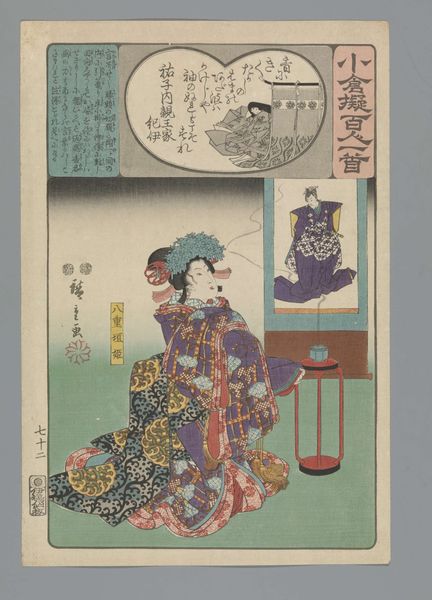 Editor: Here we have Matora's woodblock print from around 1890-1900, portraying Yugiri, a courtesan. There's a stillness about the image, but also a complexity in the patterning of her robes. What do you see in this piece from a different angle? Curator: Well, I am immediately drawn to the production of this Ukiyo-e print, not just the subject. Consider the woodblock process: the labor involved, the transfer of design, the carving, the inking, and the careful layering of colors. These materials—the wood, the paper, the inks—are central to the art's existence. The choice of those specific pigments matters. Also, we must consider the broader social context: How does mass production through woodblock printing impact the perceived value of art, blurring the lines between high art and craft? Editor: That's interesting; I hadn't thought so much about the actual making of it. Is that the point? To consider production over artistry? Curator: Not 'over,' but 'alongside'. The 'artistry' is undeniable, but inseparable from its mode of production. What social and economic systems enabled this print to exist, and how did the artist navigate those forces? The commercial context is unavoidable with Ukiyo-e. Prints such as these weren't precious objects in the traditional sense. How does the materiality challenge the aura of a unique masterpiece? Editor: So by examining the materials and techniques, we get a clearer picture of its value and social impact in society, then and now. I see this image in a different light, now! Curator: Precisely! And appreciating how it challenged definitions and production processes is crucial.