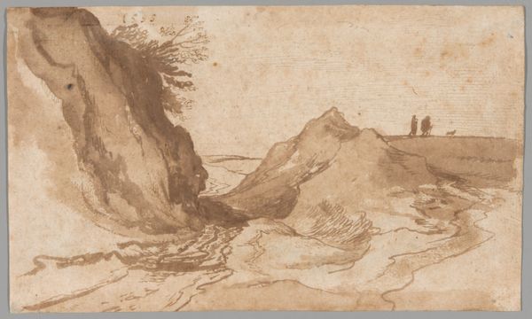 Editor: We’re looking at “Stormy Landscape with Fishermen at Sea,” from around the 17th century, currently held at the Minneapolis Institute of Art. It appears to be watercolour on toned paper. It’s really striking how the artist captured the dynamism of the wind and water with such delicate brushstrokes. How do you interpret the composition in this piece? Curator: The composition immediately suggests a structured interplay between form and void, an application of semiotics if you will. Consider the use of the fan shape itself; it dictates a reading that moves along a curve. Note the balance created between the density of the ink in the foreground rocks and foliage and the relatively empty expanse of sky and water. How does this structural division impact your perception of the landscape itself? Editor: I see how that curvature affects how I view the boat's trajectory. It emphasizes their navigation against the elements. I guess it guides my eyes more, making it feel less chaotic. But, what is the artist trying to convey by playing with these elements in a pictorial sense? Curator: The interplay of contrasting textures and tonalities creates an evocative tension. The rough, jagged rocks are juxtaposed with the fluidity of the water. Similarly, there is dynamic interplay between solid and ephemeral forms. How would you say that these contrasting elements inform the aesthetic experience? Editor: That is so interesting. I had not looked at it in such abstract terms before. Now it looks almost less like a depiction and more like a statement, maybe even a proposition! Curator: Precisely. Now consider that our statement is framed, bound in the edges of a fan, ready for discourse or consideration. In doing so we participate with the work, bringing life to the space it contains, until, one day, it begins again... Editor: That’s given me a whole new way of thinking about landscape painting. Curator: Indeed. Analyzing the formal structure can open a dialogue about an artist's intent without relying on external narratives.